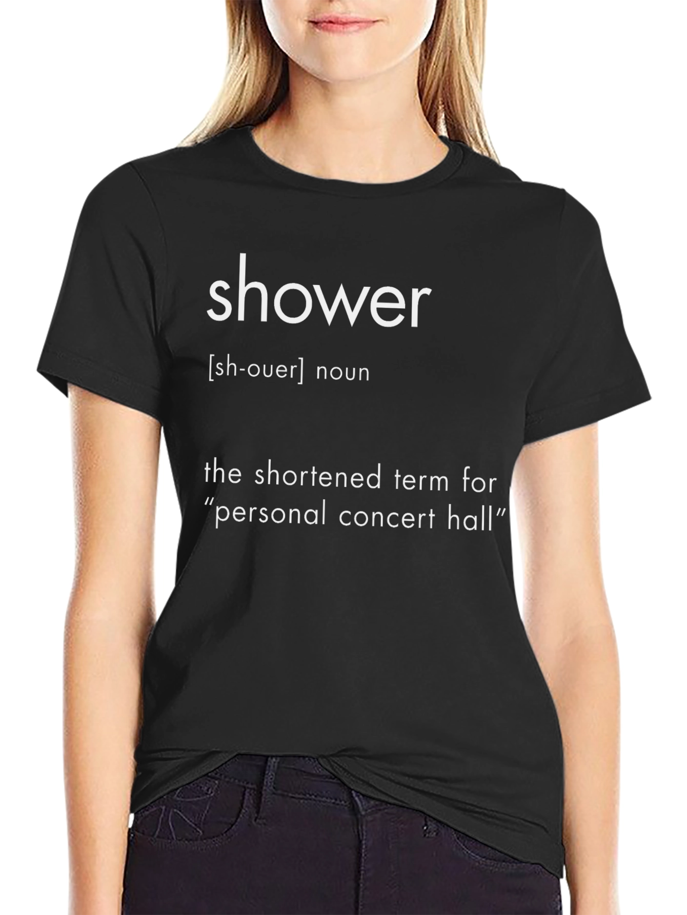 This sleek black tee humorously defines "shower" as the shortened term for a "personal concert hall." The white, easy-to-read text stands out against the dark background, making a statement without being too loud. Made from a comfortable-looking fabric, this shirt is perfect for casual wear, music lovers, or anyone with a good sense of humor. Wear it to the gym, lounging at home, or out with friends—it's sure to spark a conversation and show off your witty side. A fun and unique addition to any wardrobe!