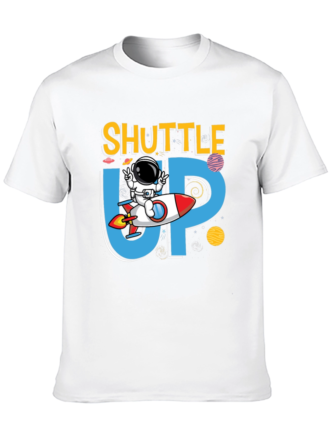 Blast off in style with this fun "Shuttle Up" graphic tee! Featuring a playful astronaut riding a rocket, surrounded by planets and stars, this black t-shirt is perfect for space enthusiasts. The design incorporates the phrase "Shuttle Up" with the "UP" stylized as a rocket launch. Made from a soft, comfortable material, this tee is great for everyday wear, casual outings, or as a unique gift for the space lover in your life. Show off your cosmic sense of humor with this eye-catching shirt!