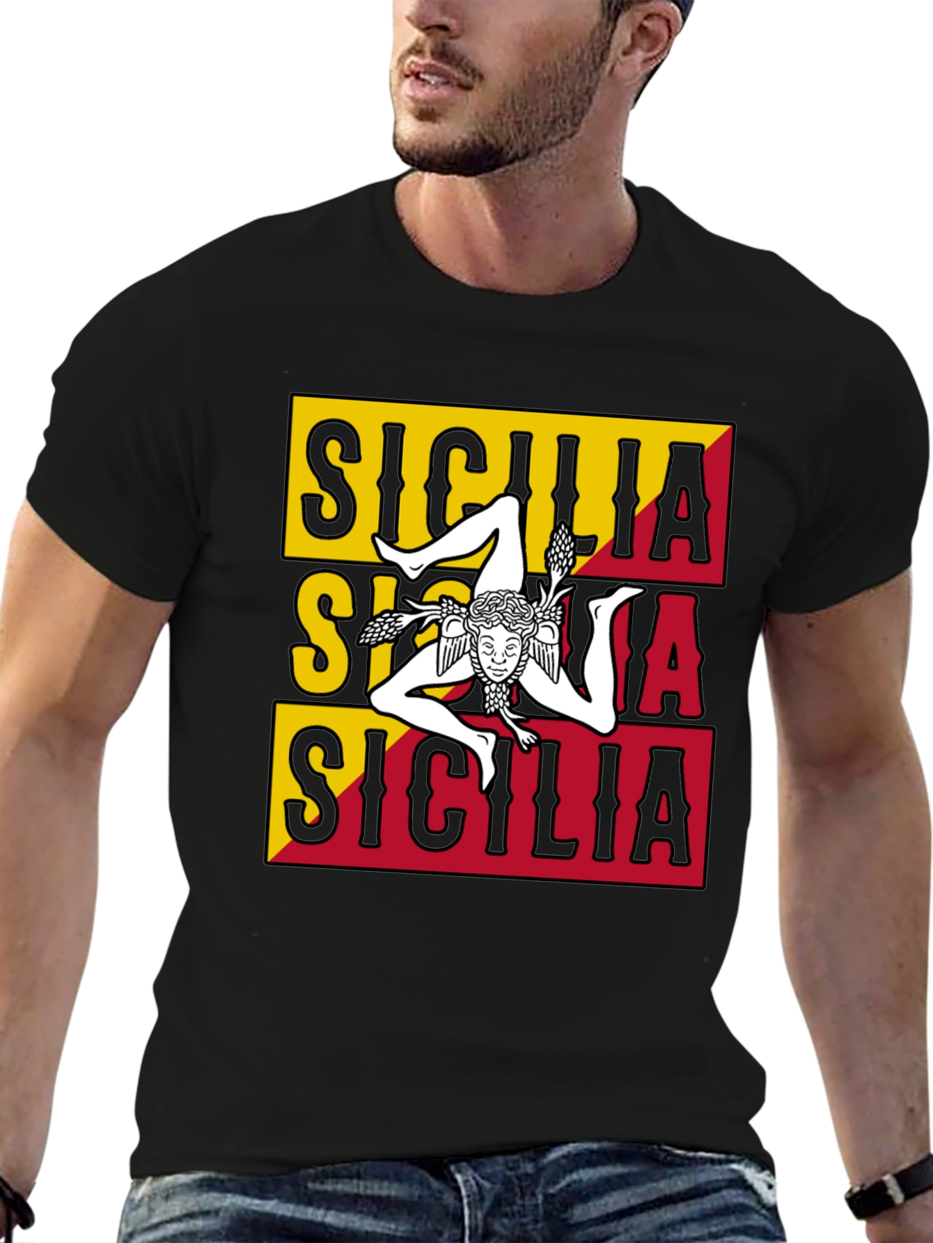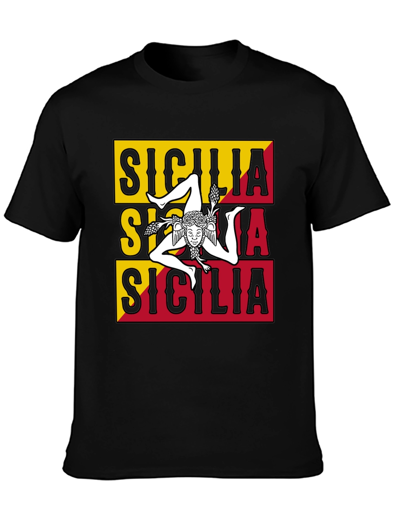 Show your Sicilian pride with this striking black t-shirt featuring the iconic Trinacria symbol. The design showcases the word "Sicilia" stacked three times in bold yellow and red boxes, with the white Trinacria figure prominently displayed in the center. Made from a comfortable material, this tee is perfect for casual wear, cultural events, or as a unique gift. The eye-catching graphic and strong colors make this t-shirt a stylish way to celebrate your heritage. Wear it with pride and let everyone know about your love for Sicilia! Ideal for everyday wear or special occasions.