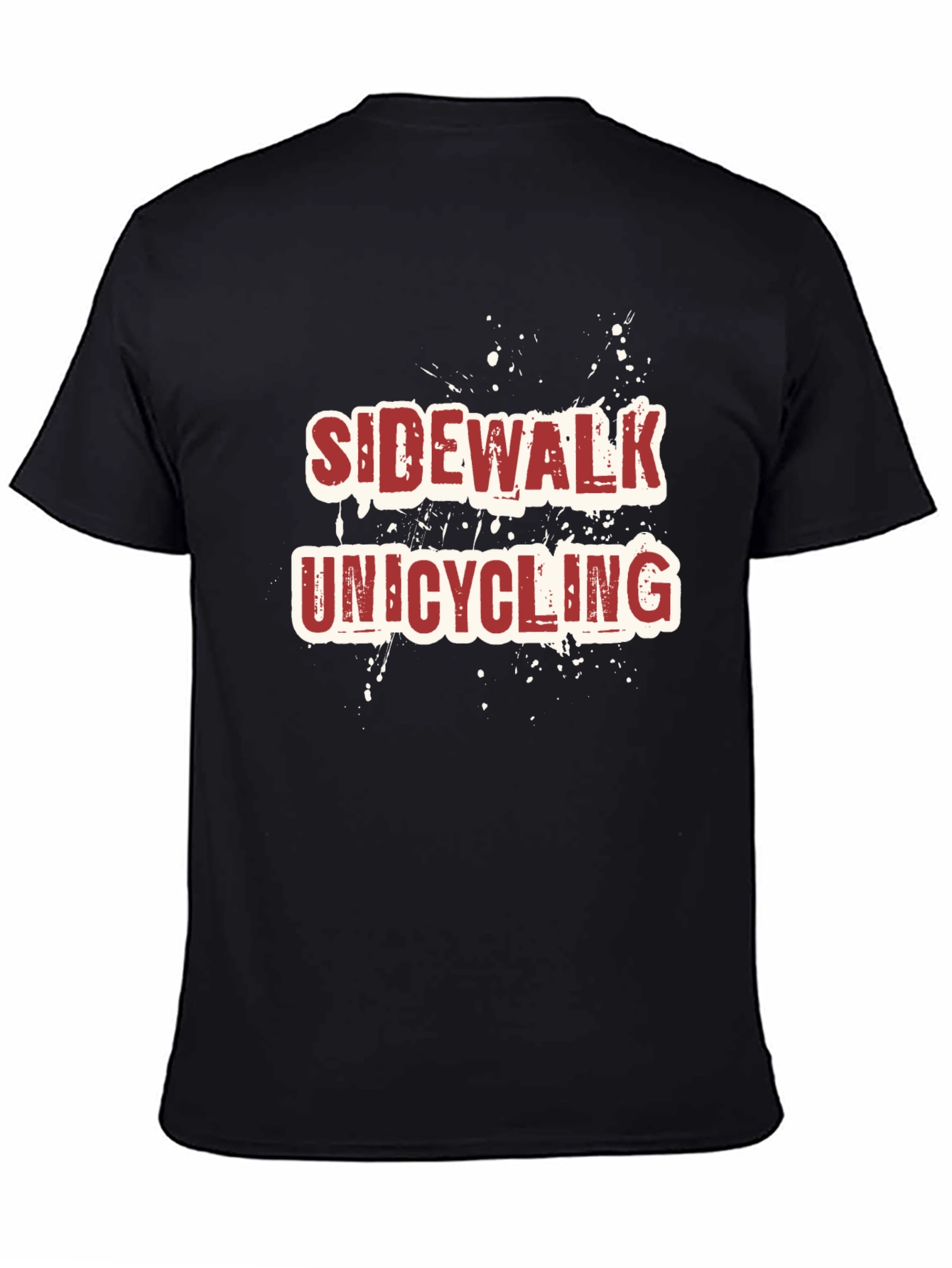 Show off your unique sense of humor with this bold, black t-shirt. The striking red and white graphic features the phrase "Sidewalk Unicycling" in a distressed font, complete with a paint splatter effect for added edge. Made from a soft-looking fabric, this tee promises both comfort and durability. Perfect for casual wear, it is ideal for expressing your quirky style. Whether you're a unicycling enthusiast or just appreciate a good laugh, this t-shirt is sure to turn heads and spark conversations. Grab this fun tee and add a touch of irreverence to your everyday wardrobe!
