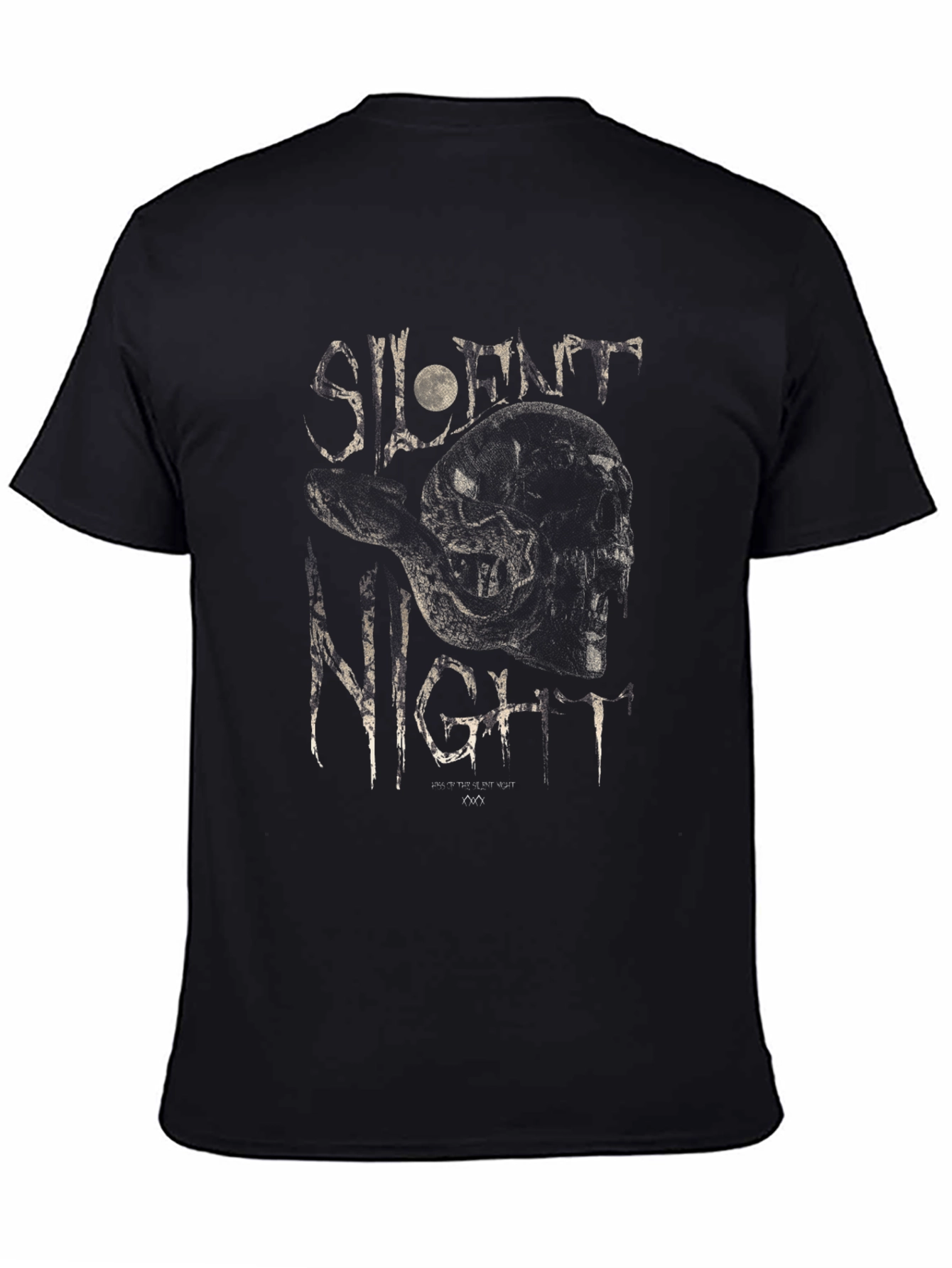 Embrace the darkness with this edgy black t-shirt featuring a striking skull graphic. The design incorporates the words "Silent Night" in a distressed, gothic-style font, overlaid on a haunting skull illustration. A moon accent shines above the skull. Made from a comfortable-looking, soft fabric, this tee offers a relaxed fit perfect for casual wear or making a bold statement. Ideal for fans of alternative fashion, horror enthusiasts, or anyone seeking a unique, eye-catching addition to their wardrobe. Wear it to concerts, parties, or simply for everyday style with an edge.