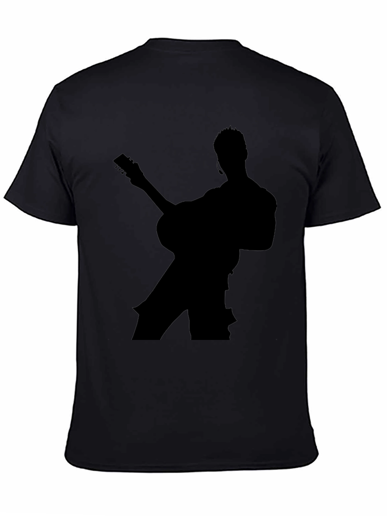 Rock out in style with this eye-catching black t-shirt featuring a bold silhouette graphic of a guitarist. The solid black color provides a sleek and versatile backdrop for the dynamic musical design. Made from comfortable and breathable fabric, this tee is perfect for everyday wear or making a statement at your next concert or casual event. Show off your love for music with this unique and stylish addition to your wardrobe. The classic crew neck and short sleeves ensure a timeless fit. This t-shirt effortlessly combines comfort and artistic expression.
