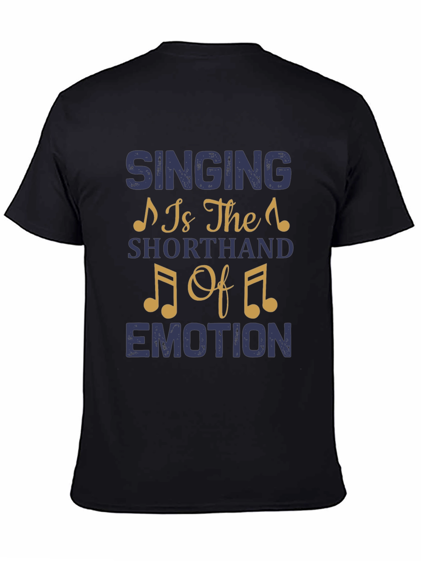 This black t-shirt features a bold graphic design with the phrase "Singing is the shorthand of emotion." The text is in a stylish font and uses musical notes as visual elements, adding a creative touch. It appears to be made of a comfortable fabric, ideal for everyday wear. The design is perfect for music lovers, singers, or anyone who appreciates artistic apparel. Wear it casually with jeans or shorts to express your passion for music and emotion.
