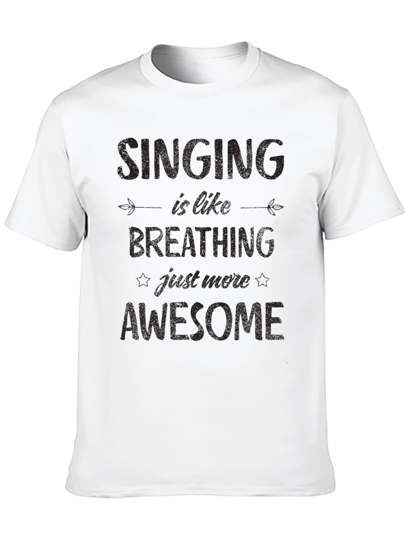 Show off your love of singing with this "Singing is like breathing, just more awesome" t-shirt. This classic-fit tee is made from a soft, comfortable material that feels great against your skin. The printed graphic design is eye-catching and humorous, making it a great conversation starter. Its simple design makes it easy to pair with jeans, shorts, or even dress pants. Perfect for casual wear, music events, choir practice, or as a thoughtful gift for the singer in your life.
