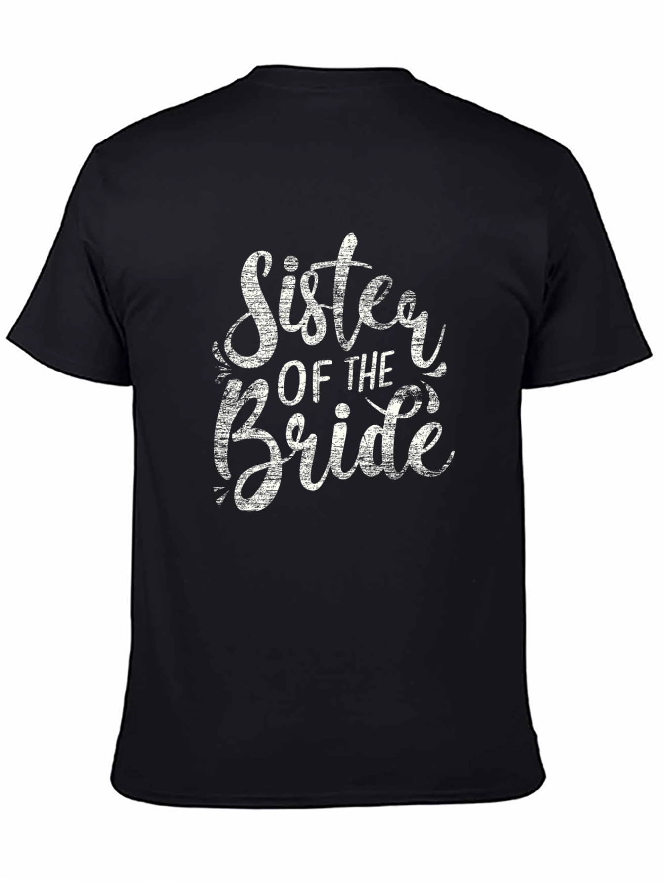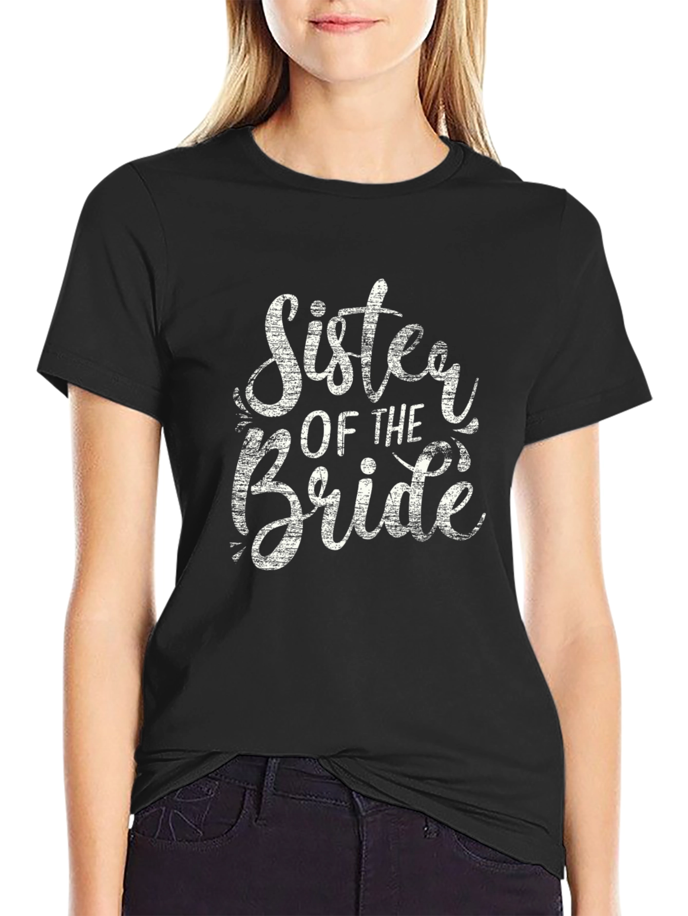 Celebrate the special day with this stylish black t-shirt! Featuring a distressed, white "Sister of the Bride" graphic, this tee is perfect for the bridal party. The classic crew neck and comfortable fit make it ideal for all-day wear at the wedding, rehearsal dinner, or bachelorette party. Show your support and stand out in this fun and fashionable t-shirt. Its soft fabric ensures comfort, while the bold design makes a statement. It's a memorable keepsake for the sister of the bride.