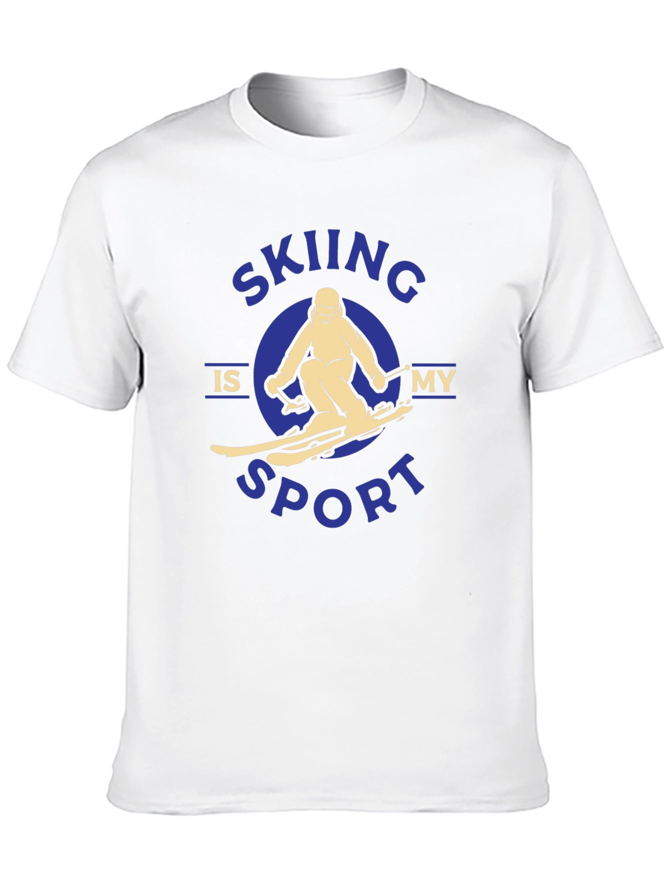 Hit the slopes in style with this unique graphic tee! Made from a comfortable, breathable fabric, this black t-shirt features a bold and eye-catching design. A skier figure is showcased inside a vibrant blue circle with the text "SKIING IS MY SPORT" arced above and below in blue lettering. The short-sleeve design makes it perfect for layering or wearing on its own. Ideal for casual wear, ski trips, or showing off your love for winter sports. Makes a great gift for skiers and snowboarders alike. Get yours today and let everyone know what your sport is!