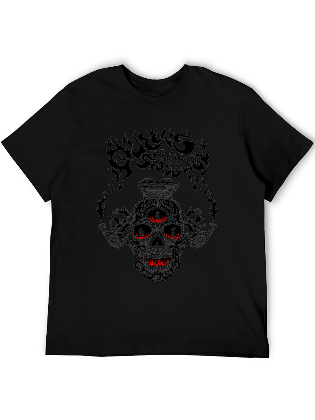 Rock a unique look with this eye-catching black t-shirt! This shirt features a bold graphic design of a skull made of engine parts, topped with a fiery rendition of "Queens of the Stone Age". The intricate design, with its red accents on the eyes and mouth, creates a striking contrast against the dark background, making it a standout piece. Made from soft, comfortable fabric, this tee is perfect for casual wear, concerts, or expressing your unique style. Add an edge to your wardrobe with this cool t-shirt!
