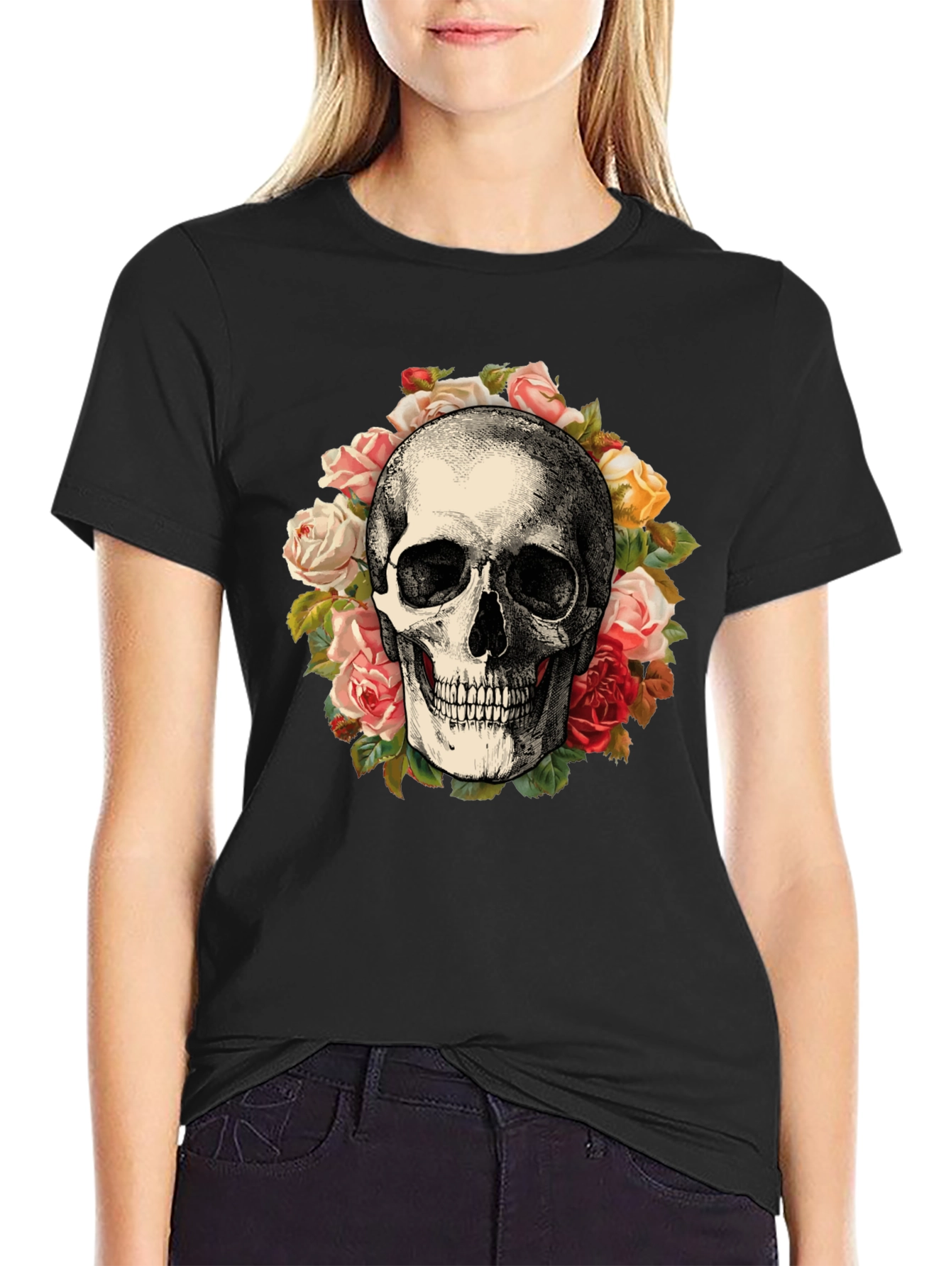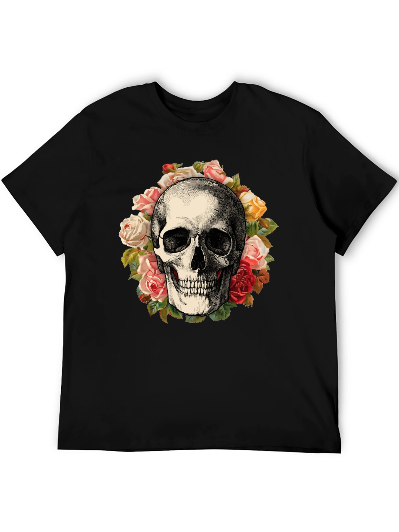 This black t-shirt features a striking graphic print of a skull surrounded by an array of beautiful roses. The design offers a unique blend of edgy and elegant styles, perfect for making a statement. Made from a comfortable, soft fabric, this t-shirt is ideal for everyday wear, concerts, or casual outings. Its classic crew neck and short sleeves ensure a relaxed fit. Pair it with jeans or shorts for a stylish, effortless look. A must-have for anyone who loves bold, artistic apparel. Show off your unique style with this eye-catching tee.