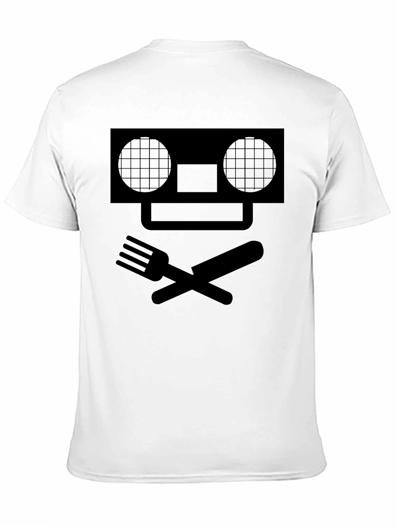 This striking black t-shirt features a unique graphic design of a stylized skull and crossbones made from a cassette tape face with circles on each side and crossed utensils (a fork and a knife). The bold black print stands out prominently against the tee's background. Made from what appears to be a comfortable and breathable fabric. This tee would be perfect for casual wear, music events, or culinary adventures. It's a distinctive addition to any wardrobe, offering a blend of edgy style and practical comfort.
