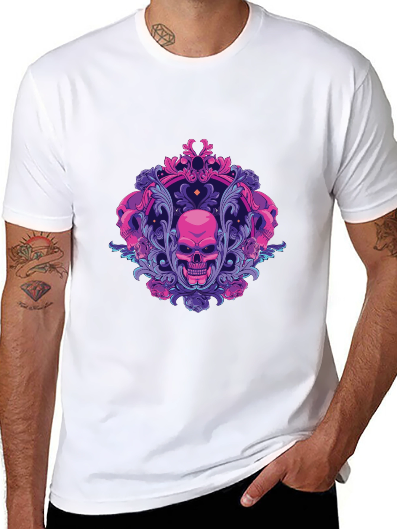 This black t-shirt features a bold and vibrant graphic design of a skull surrounded by ornate floral and crown-like elements. The artwork is rendered in shades of pink and purple, giving it a striking and modern look. Made from a soft, breathable fabric, this tee offers a comfortable fit for everyday wear. Perfect for adding a touch of edgy style to any outfit, whether you're heading to a casual hangout or expressing your individuality. The eye-catching design is sure to make a statement. It is a unique addition to any wardrobe, suitable for those who appreciate art and unconventional aesthetics. Consider styling it with jeans and boots for a rock-inspired look.