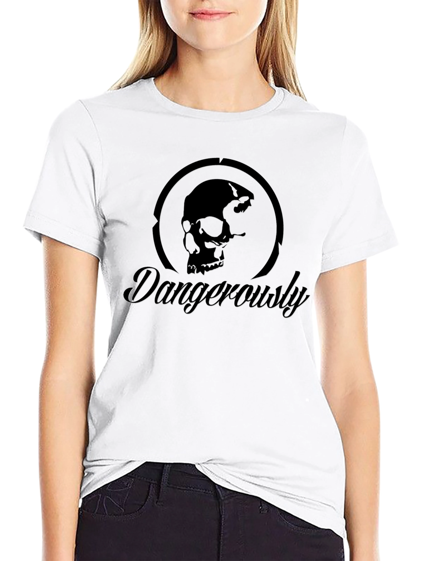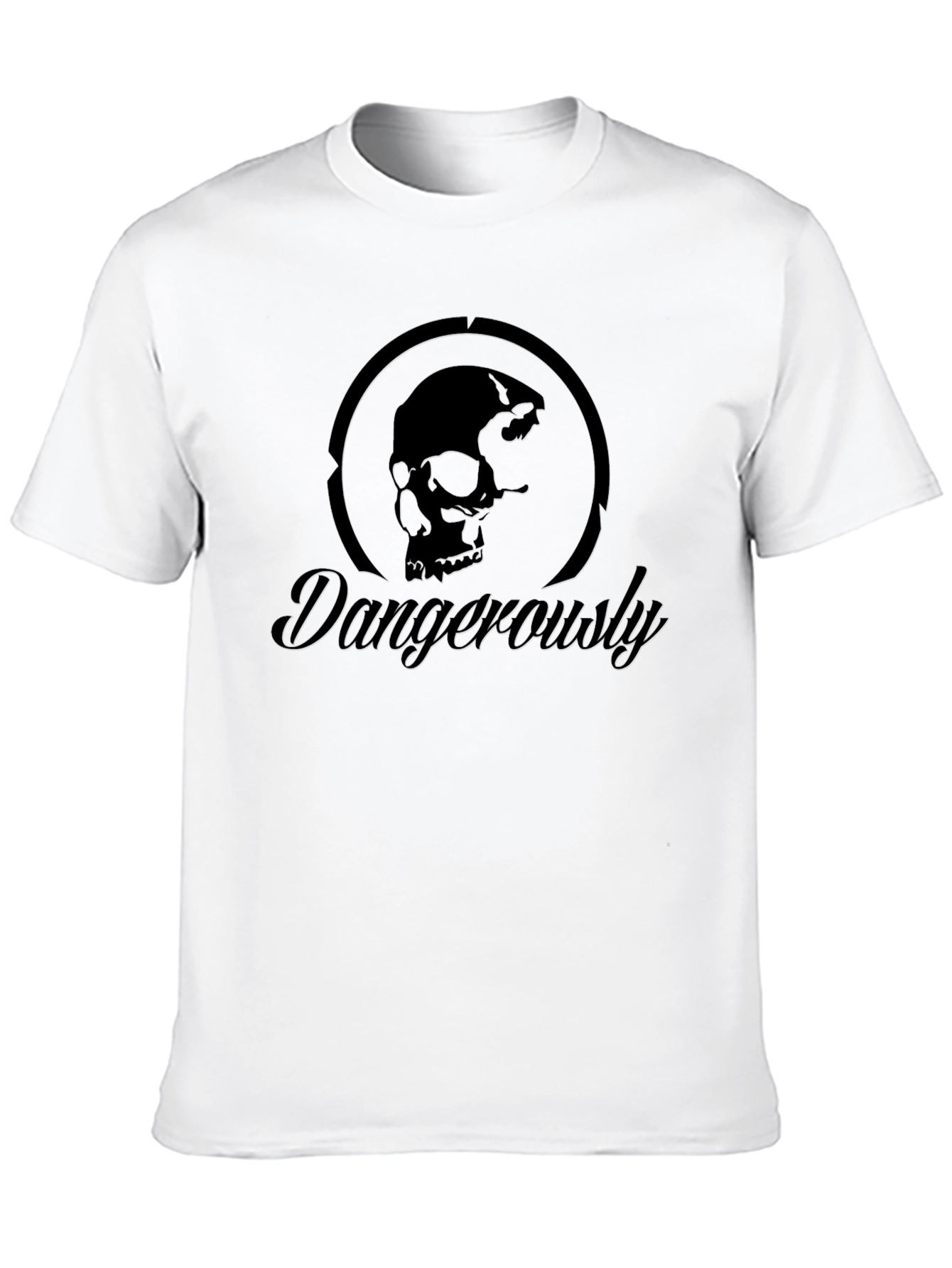 Make a bold statement with this striking black t-shirt! The design features a distinctive skull graphic encircled within a dark, shadowed ring, creating a mysterious and edgy look. Underneath, the word "Dangerously" is elegantly scripted, adding a touch of intrigue. Crafted from what appears to be a soft, comfortable fabric, this tee is perfect for everyday wear, concerts, or casual hangouts. Express your unique style and rebellious spirit with this eye-catching shirt. It is sure to be a conversation starter wherever you go.