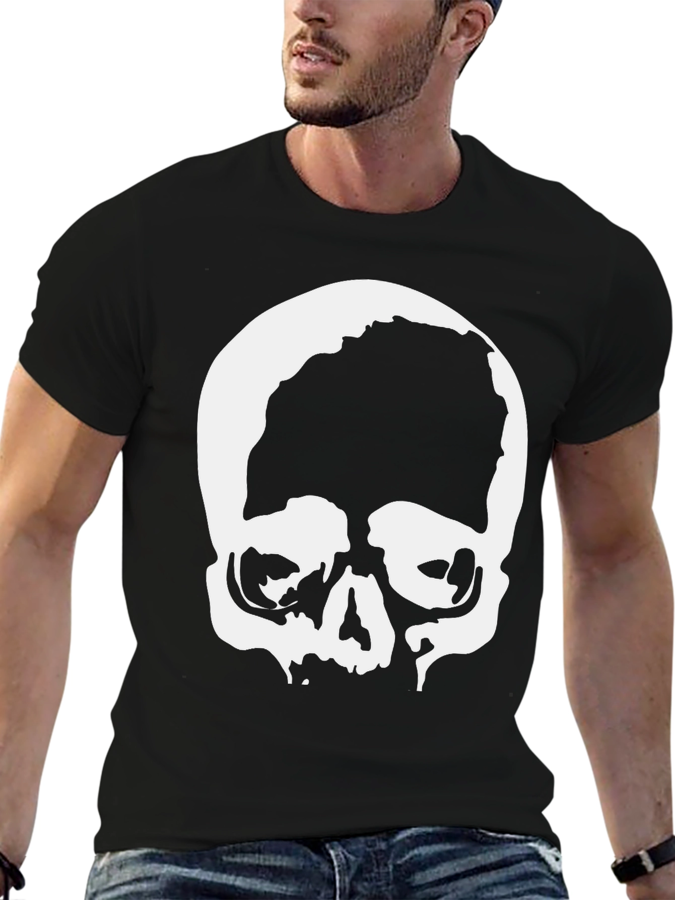 Make a statement with this striking black t-shirt featuring a bold, white skull graphic. The design is eye-catching and edgy, perfect for adding a touch of rebellious style to your wardrobe. Crafted from what appears to be a soft, comfortable cotton blend, this tee is designed for everyday wear. The classic crew neck and short sleeves offer a relaxed fit, making it ideal for casual outings, concerts, or simply lounging around. The high-contrast skull print ensures you'll stand out from the crowd. Pair it with jeans or shorts for an effortlessly cool look. This t-shirt is a must-have for anyone who loves alternative fashion.