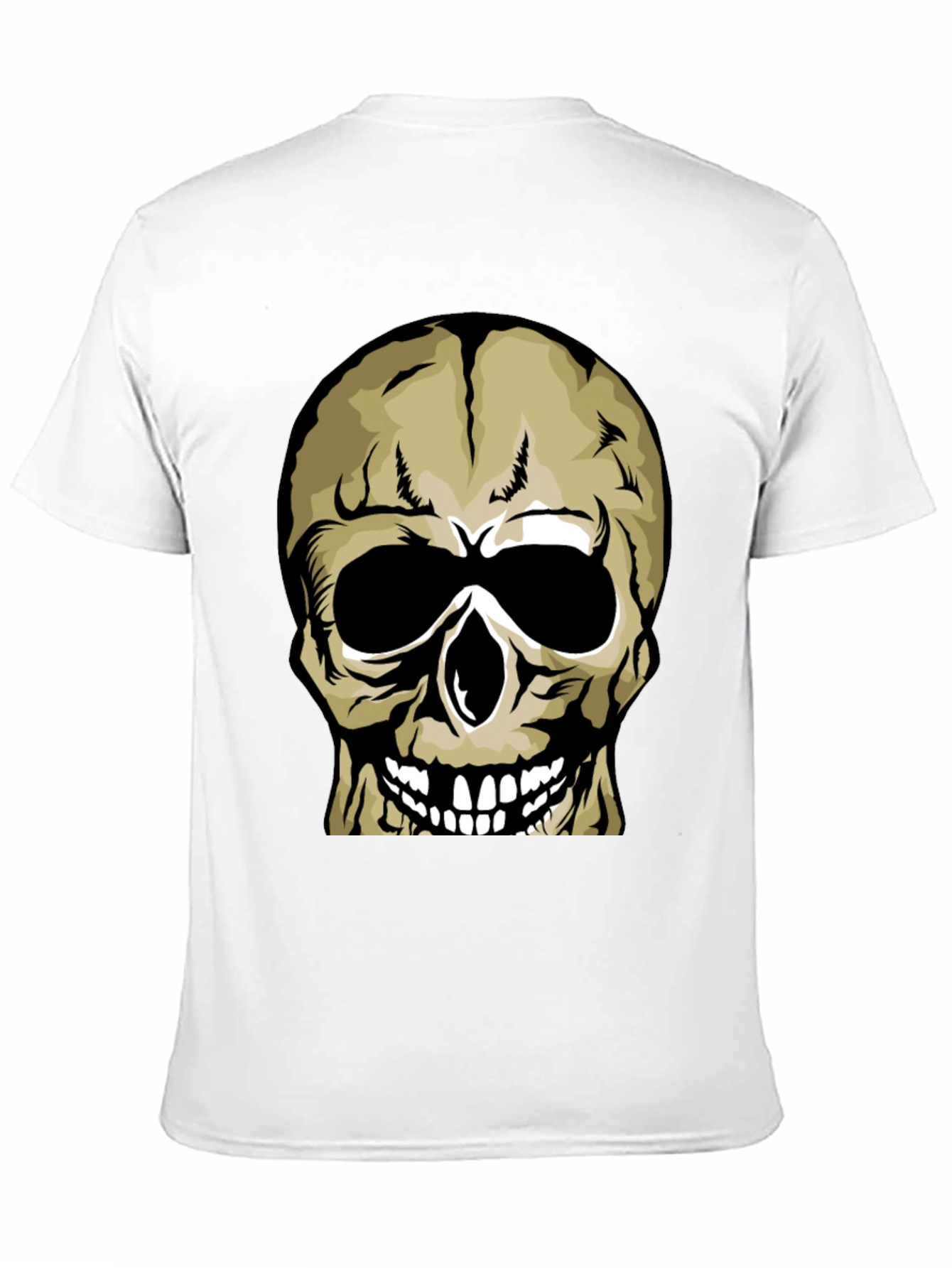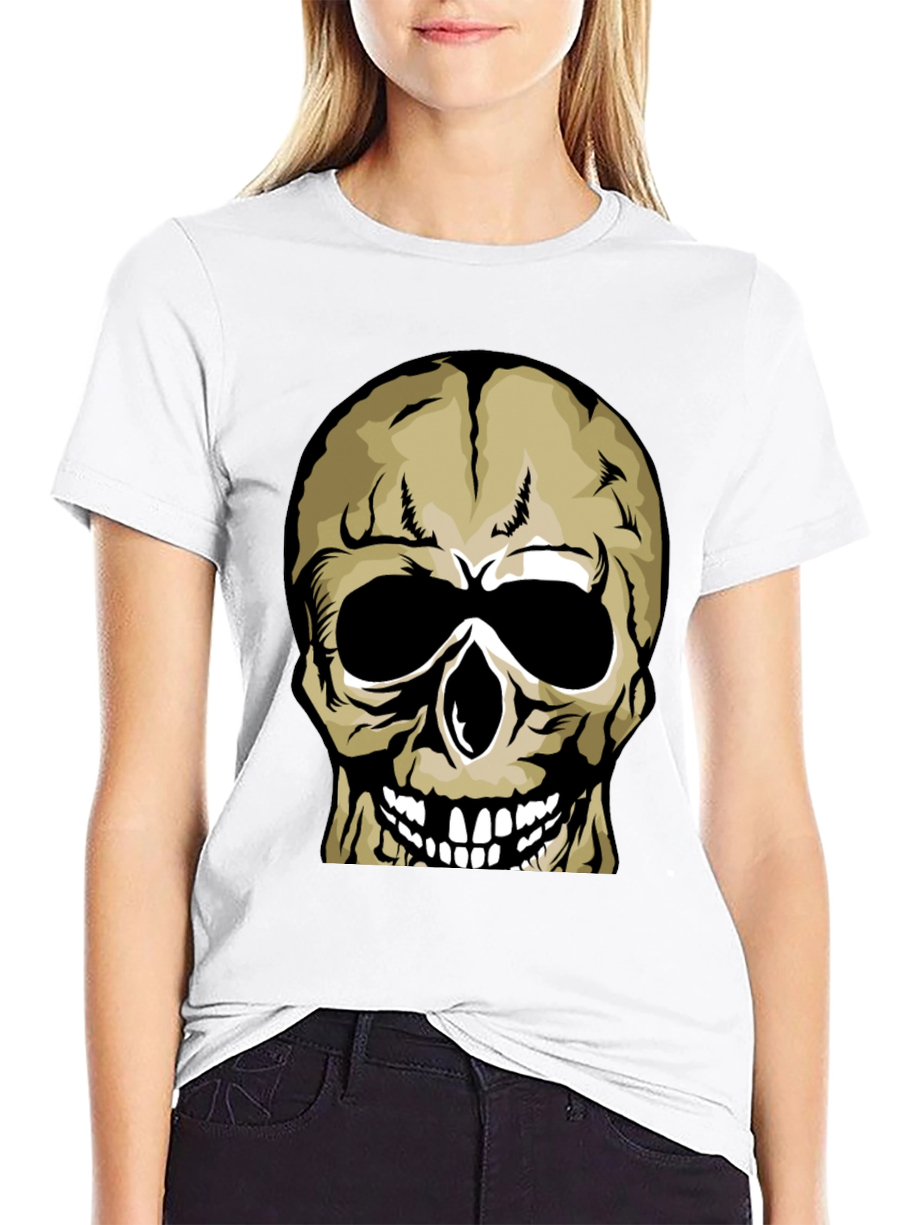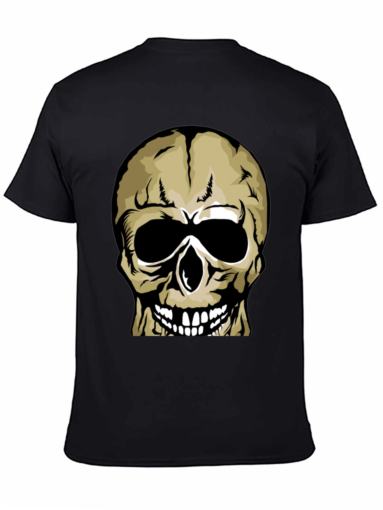 Embrace your edgy side with this striking black t-shirt, featuring a bold skull graphic. The skull is illustrated in shades of beige and black, with stark white teeth, creating a high-contrast, eye-catching design. Made from a soft, comfortable fabric, this tee is perfect for everyday wear or making a statement at casual events. Pair it with jeans or shorts for a cool, effortless look. Durable construction ensures long-lasting wear, while the classic fit provides maximum comfort. This is a must-have piece for anyone who wants to add a touch of alternative style to their wardrobe.