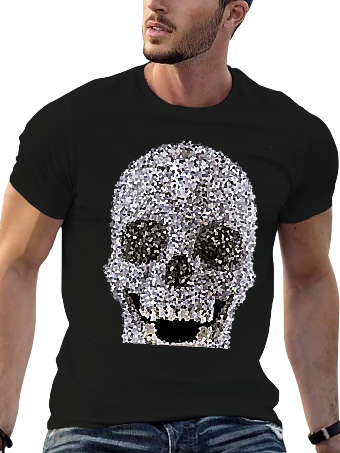 This stylish t-shirt features a unique and eye-catching skull graphic. The design is meticulously crafted from hundreds of tiny mosaic-like squares to give the skull a textured look. Made from a soft, comfortable fabric, this tee is perfect for everyday wear or for making a statement at social gatherings. The skull's intricate design stands out boldly against the dark shirt. Pair it with jeans or shorts for a casual yet trendy look. A must-have addition to any wardrobe for those who appreciate edgy and artistic fashion.