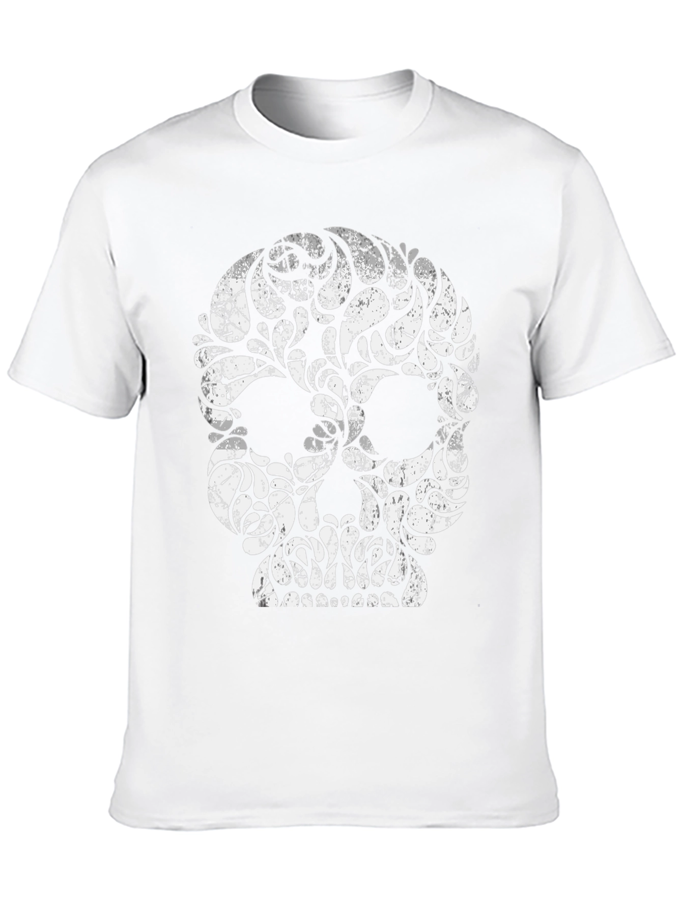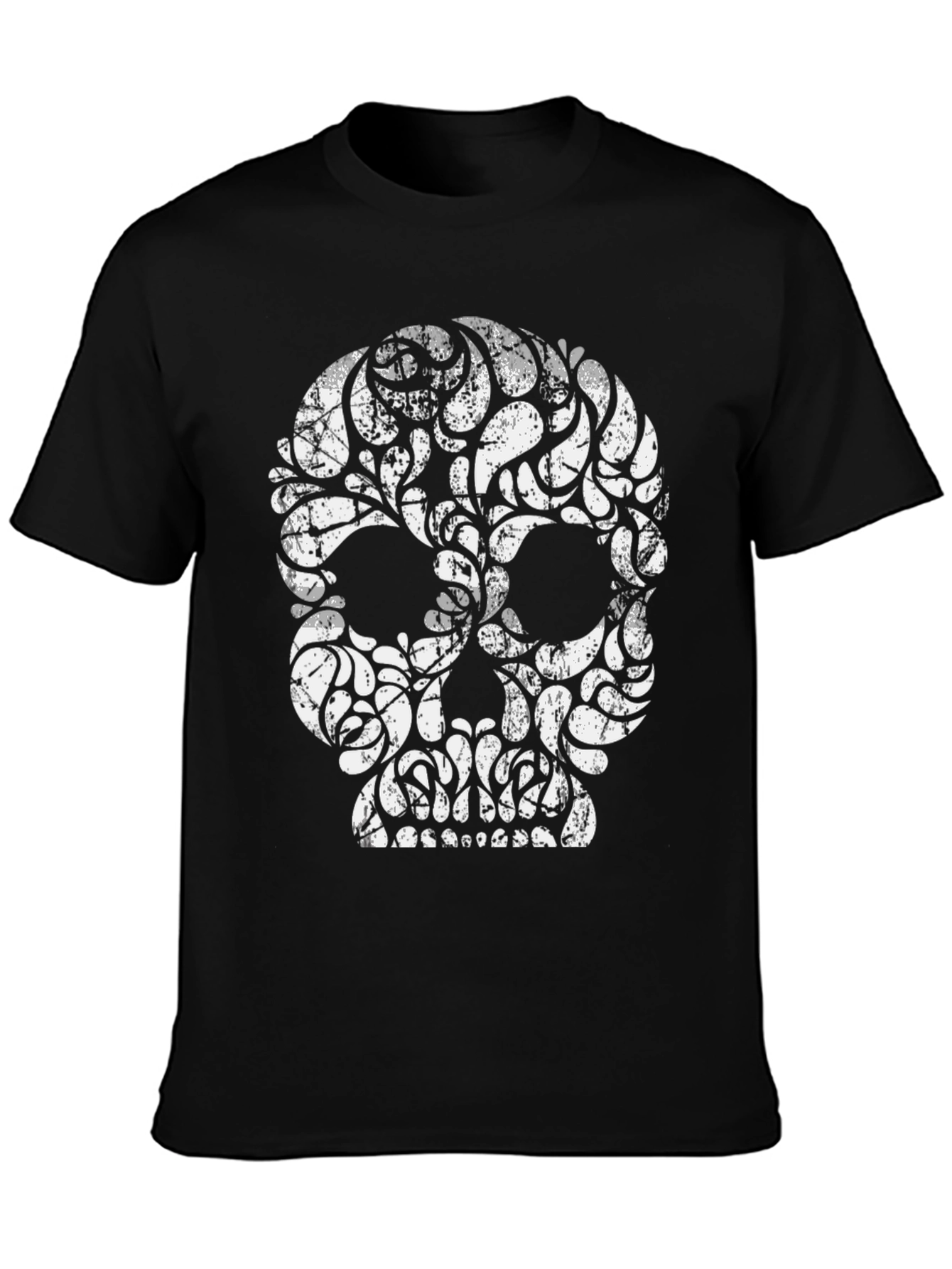 Showcase your edgy style with this striking black t-shirt featuring a unique skull graphic print. The design is crafted from intricate, distressed white patterns, forming a bold skull shape on the front. Made from comfortable fabric, this tee offers a great fit and a soft feel. Ideal for casual wear, concerts, or making a statement, this t-shirt is perfect for those who appreciate alternative fashion. Pair it with jeans or shorts for an effortlessly cool look. A must-have addition to any modern wardrobe. Makes a great gift!