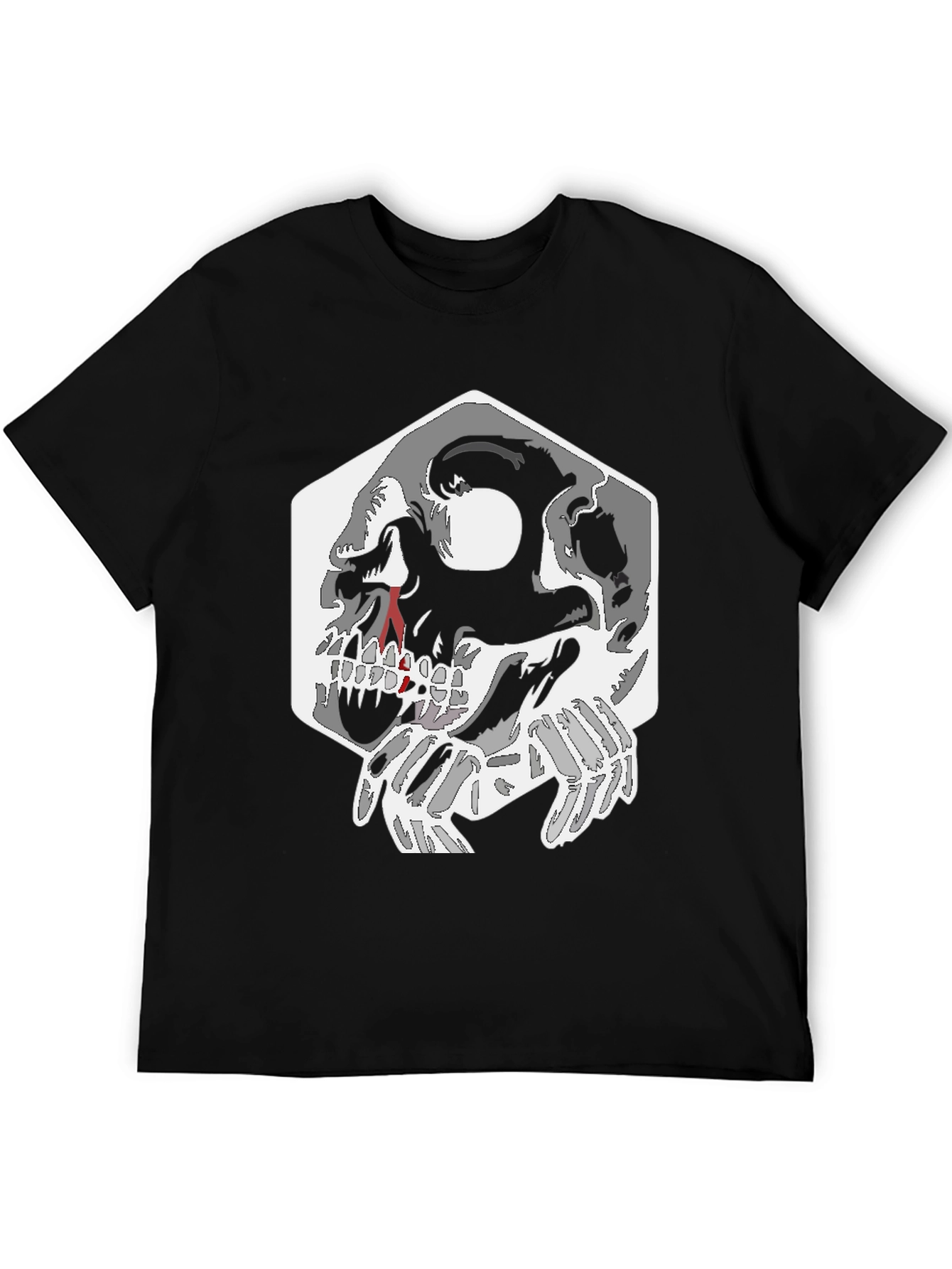 Show off your edgy style with this eye-catching black graphic tee. The shirt features a striking skull design with bone hands over a white geometric backdrop. This unique and bold design is perfect for those who want to make a statement. Crafted from comfortable, breathable fabric, this t-shirt is perfect for everyday wear or a night out. Pair it with jeans or shorts for a cool and casual look. Make a statement with this tee that is sure to turn heads. This t-shirt is a must-have for those who appreciate unique graphics and cool designs.
