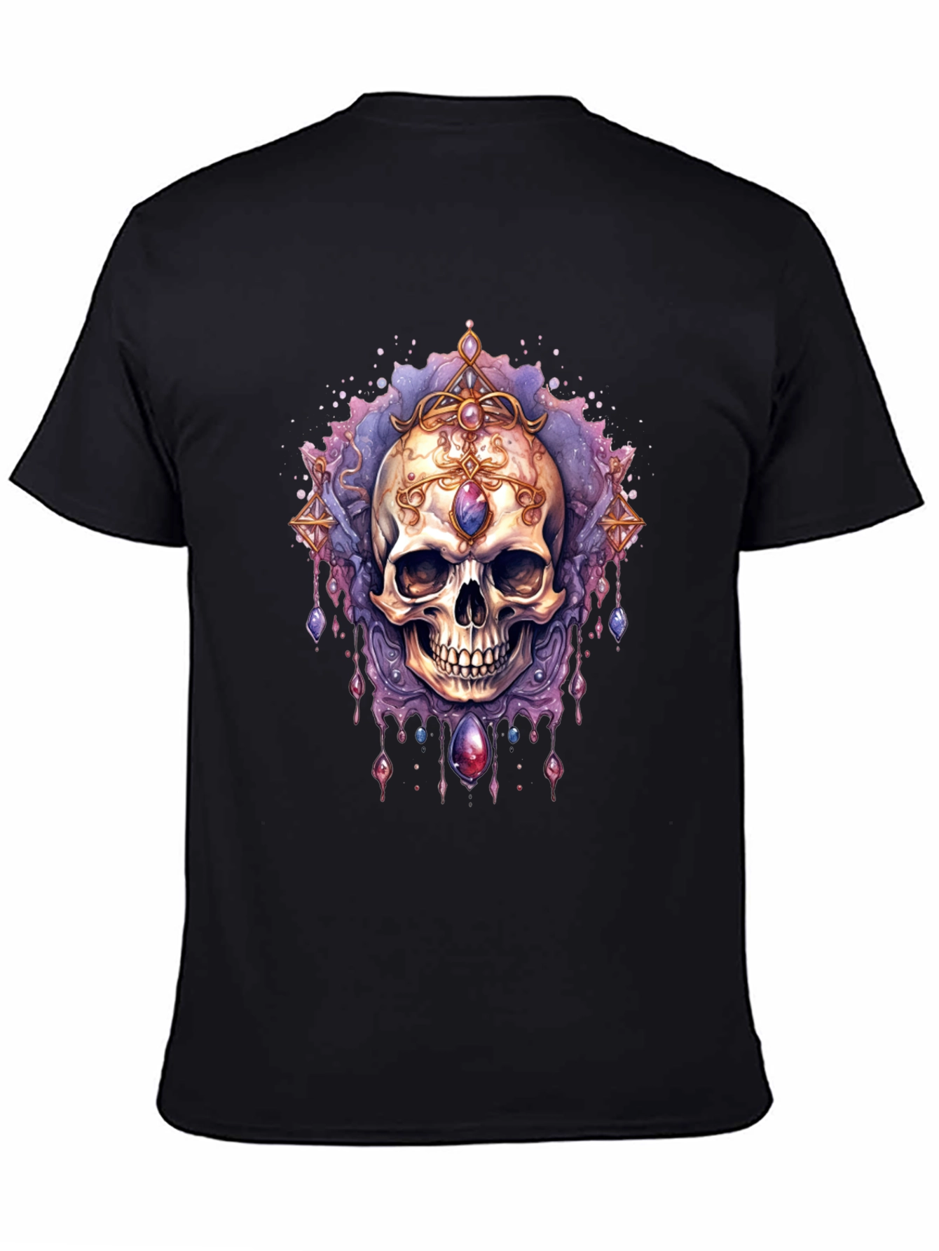 Make a statement with this unique black T-shirt featuring a striking skull design. Adorned with ornate jewels, the skull is surrounded by intricate purple and gold accents, creating a gothic and eye-catching style. Crafted from comfortable, breathable fabric, this tee is perfect for everyday wear or to add an edge to your evening look. This shirt offers a relaxed fit, suitable for various body types. Express your individuality with this bold design, great for those who appreciate gothic, alternative, or edgy aesthetics.