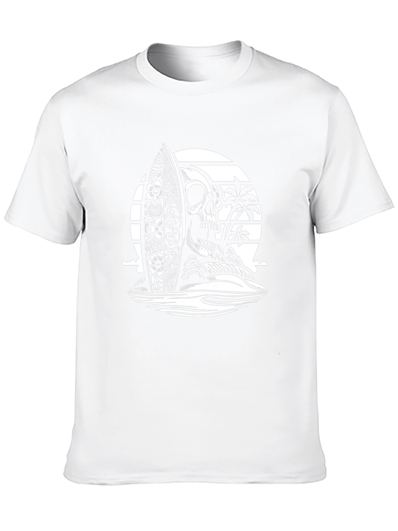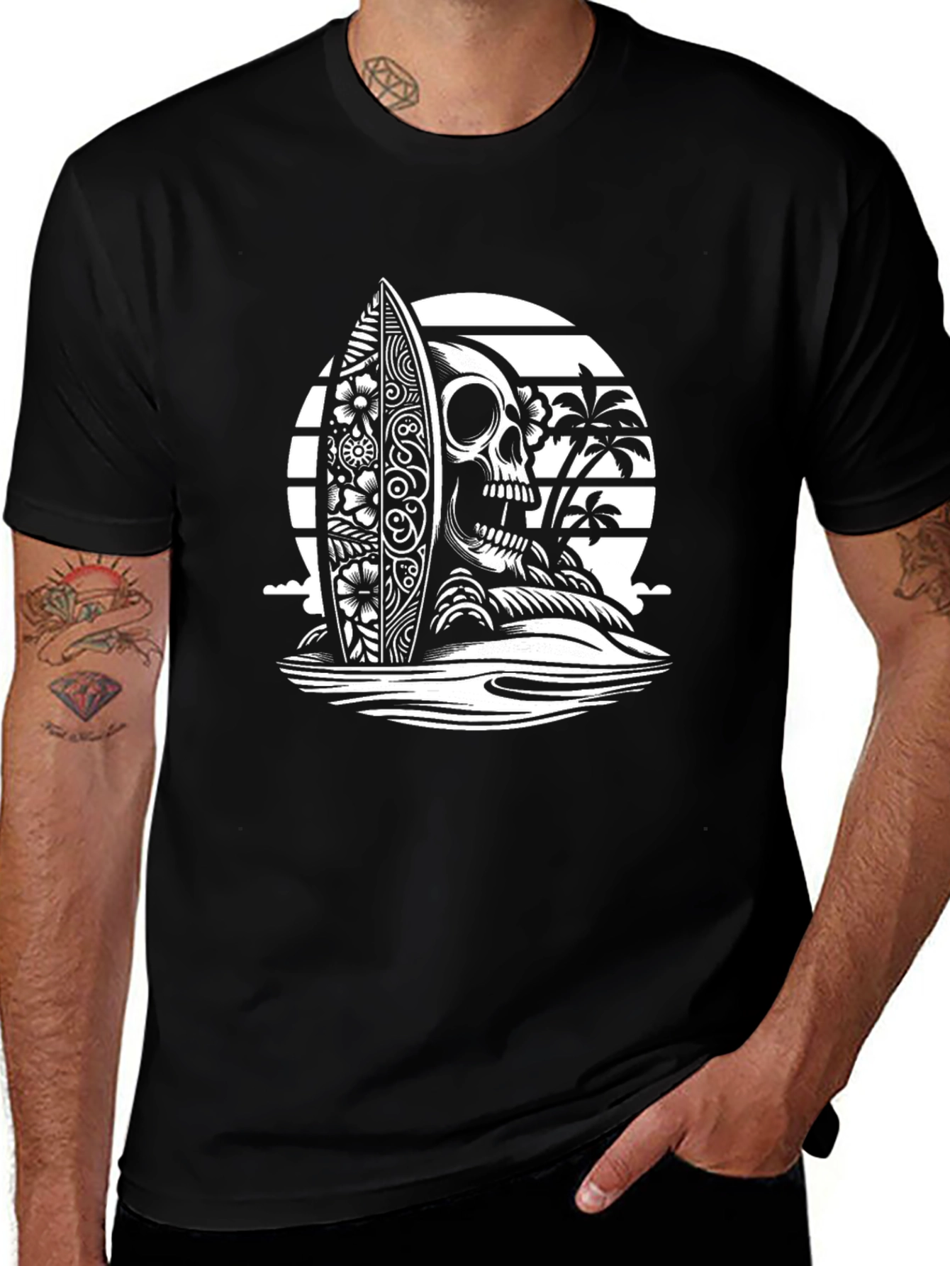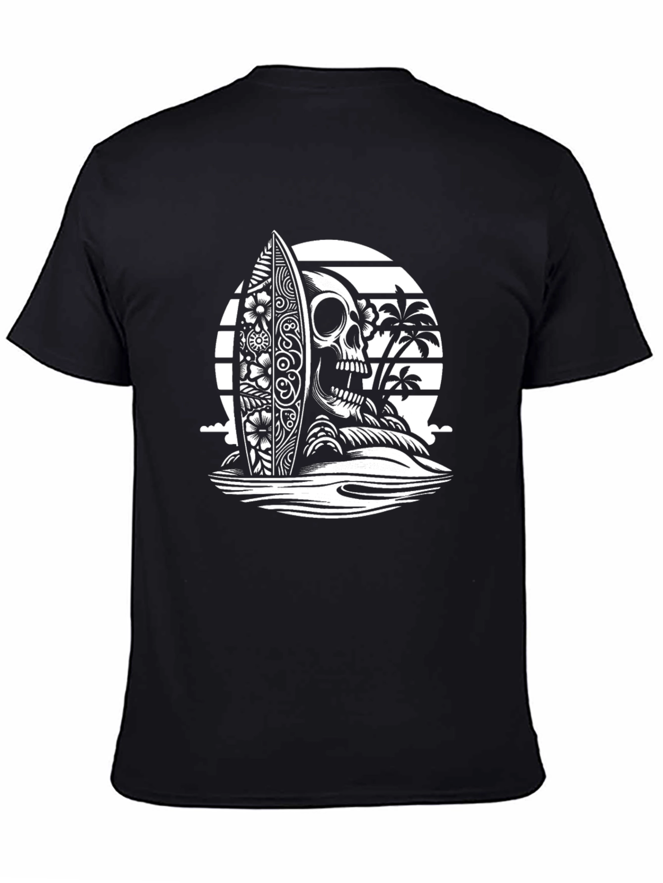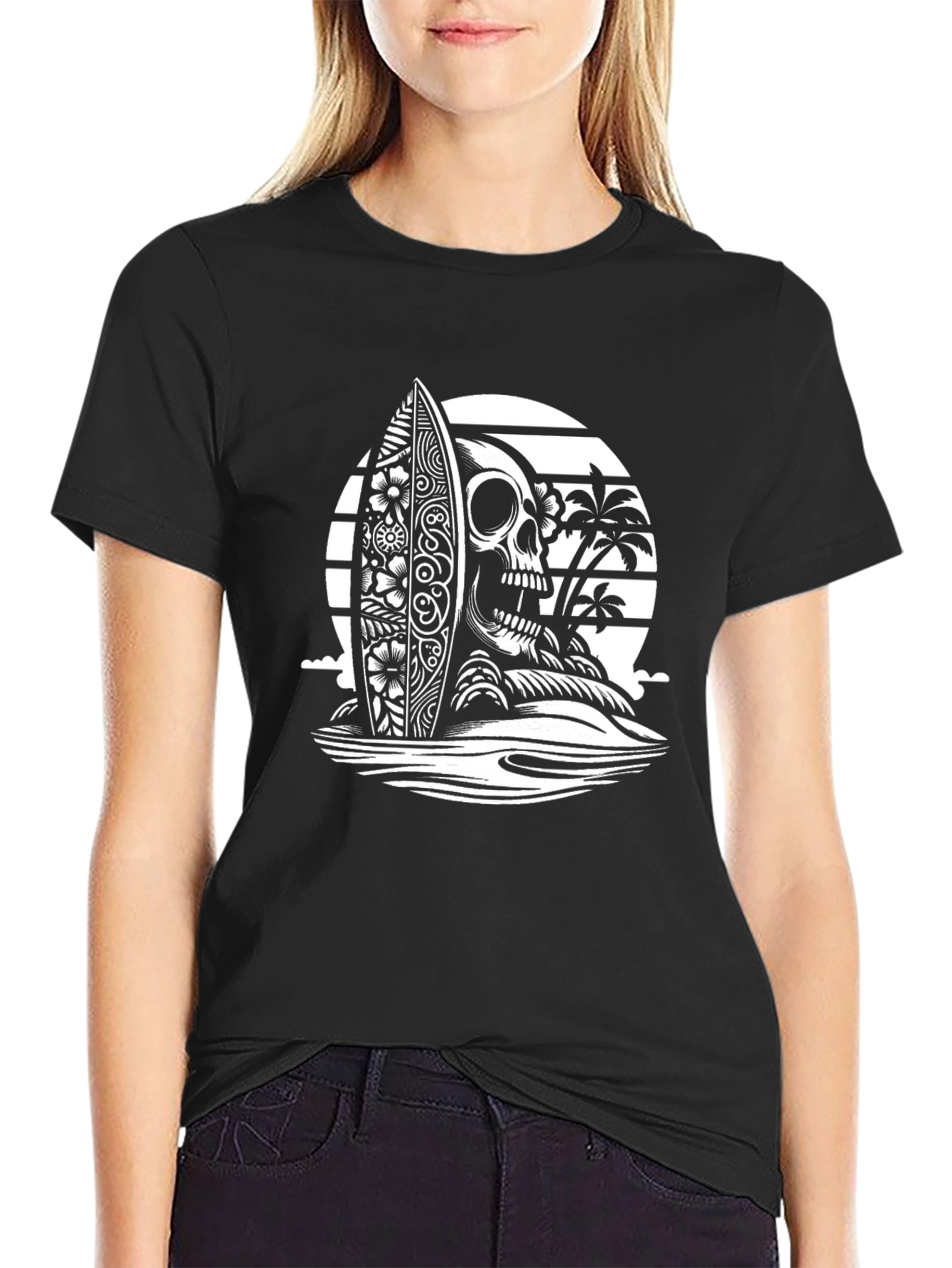 Embrace the beach vibes with this stylish black t-shirt featuring a unique graphic print. The design showcases a skull alongside a surfboard decorated with intricate floral patterns, palm trees, and a bold striped sun. Perfect for casual outings, beach trips, or everyday wear, this tee is made from comfortable fabric, ensuring a great fit and feel. Stand out from the crowd with this eye-catching design that captures the essence of surf culture and edgy style. Whether you're a surfer or just love the beach aesthetic, this shirt is a must-have addition to your wardrobe. Pair it with your favorite jeans or shorts for a relaxed, cool look.