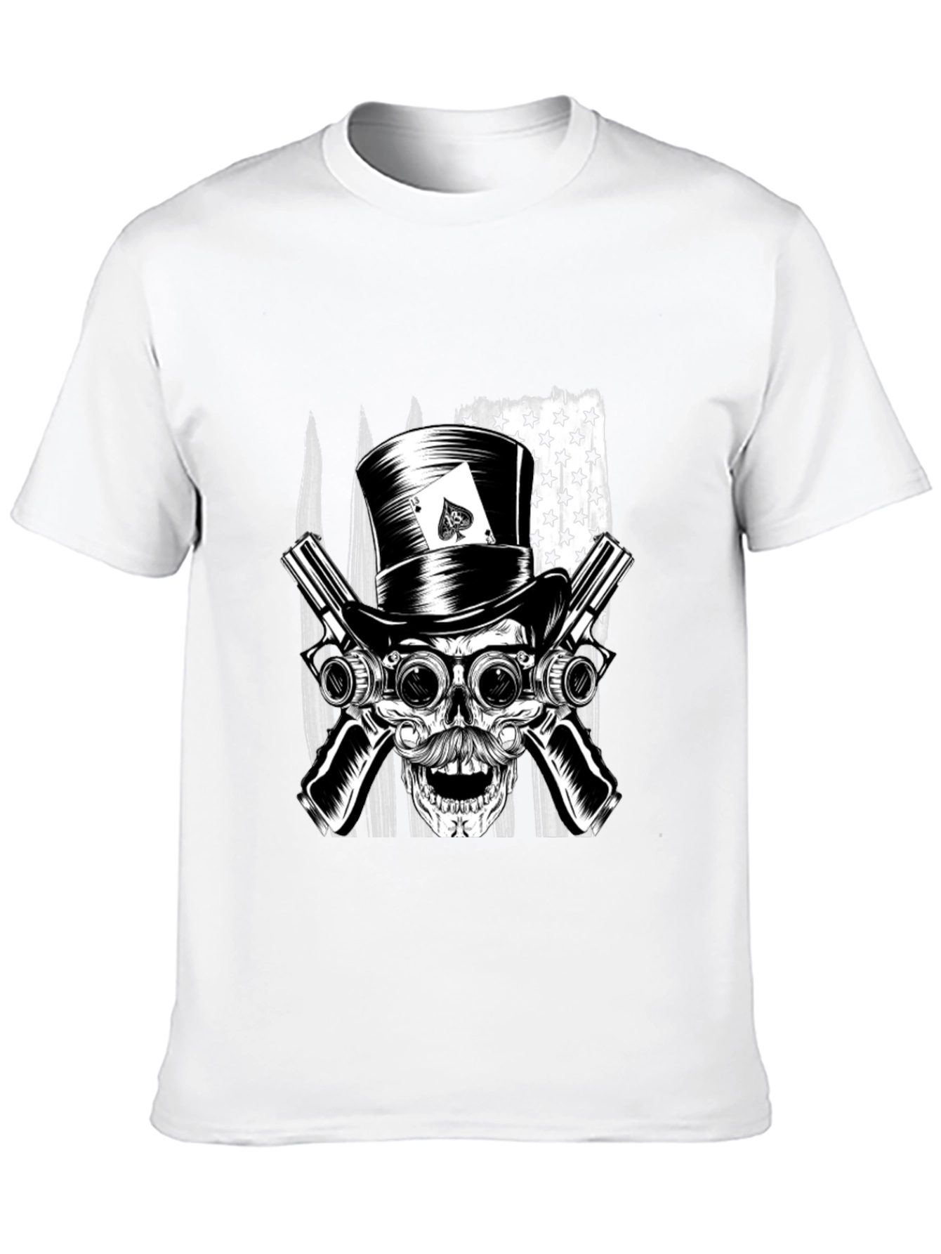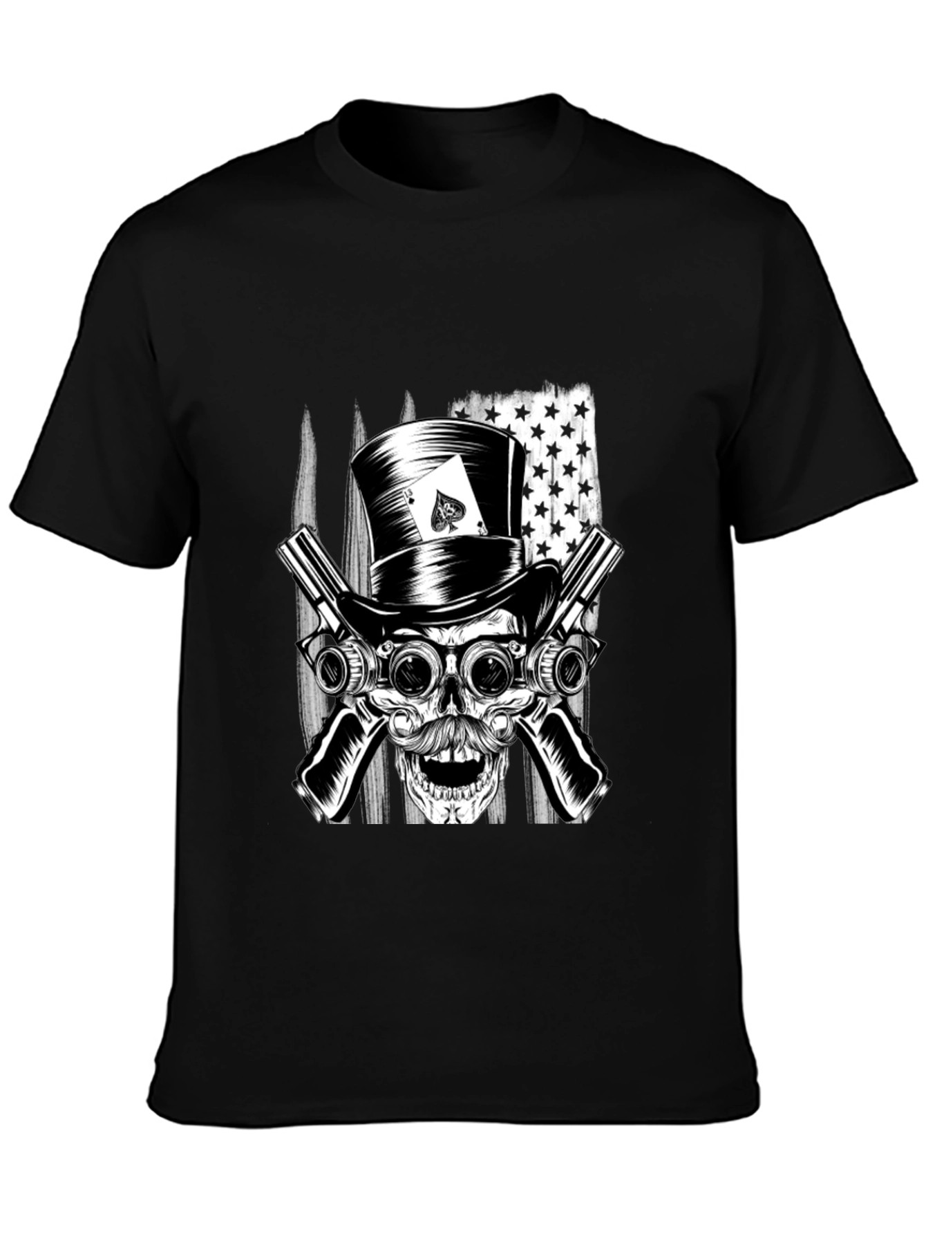 Show off your unique style with this striking graphic t-shirt. The design features a skull wearing a top hat with an ace of spades card, goggles and a distinguished mustache. Two crossed revolvers and an American flag background complete the bold look. This black t-shirt is made from comfortable materials for everyday wear. Perfect for casual outings, concerts, or adding an edgy touch to your wardrobe. Stand out from the crowd with this unique statement piece. Makes a great gift for fans of alternative fashion and those with a daring sense of style.