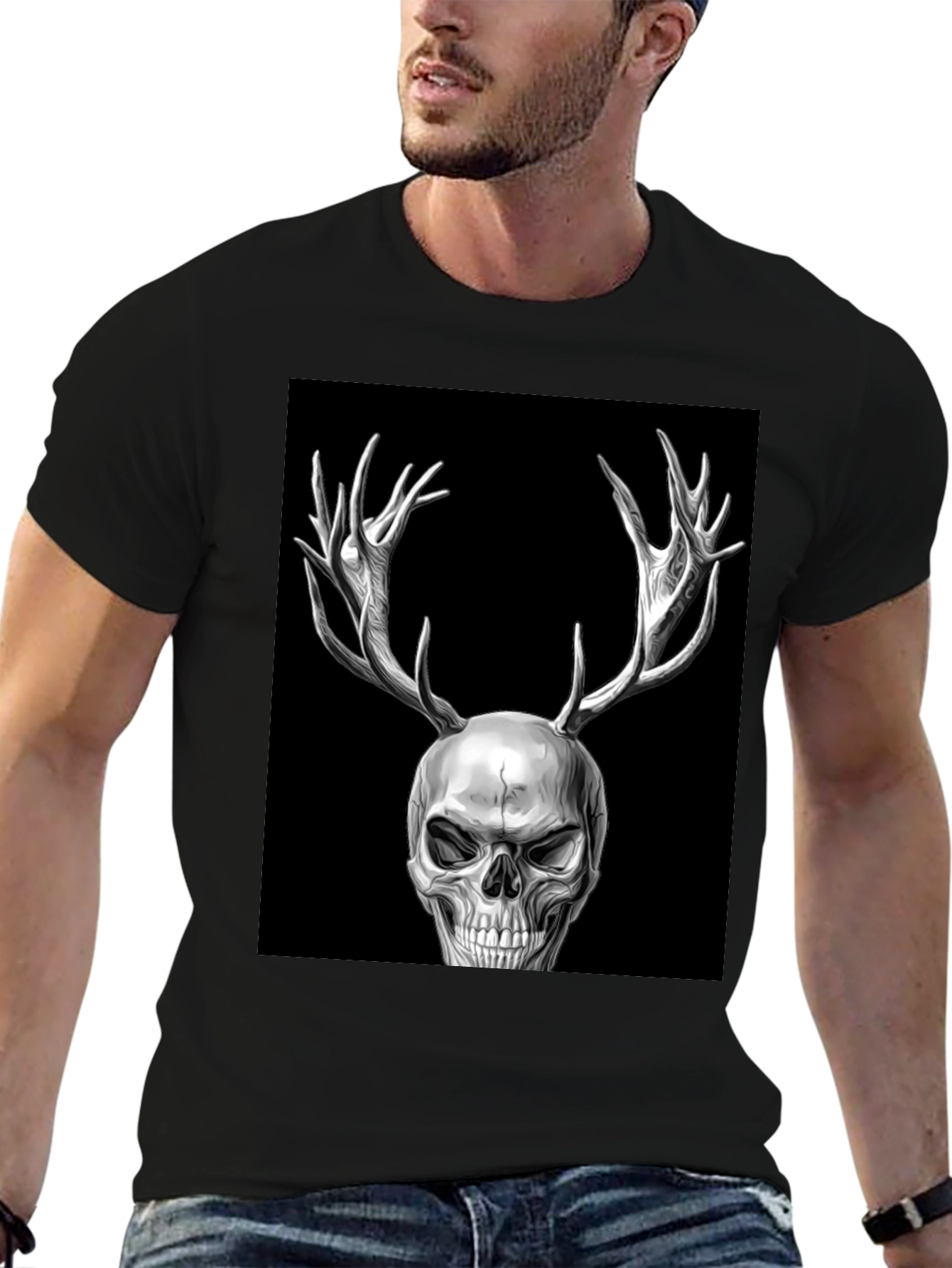 This striking black t-shirt features a bold graphic print of a skull with elaborate antlers. The detailed design is eye-catching and unique. The shirt appears to be made from a comfortable, soft fabric. Perfect for casual wear, concerts, or expressing your individual style. This t-shirt is a statement piece that will turn heads. Style this tee with your favorite jeans or shorts for a complete look. Stand out from the crowd with this unique graphic tee.