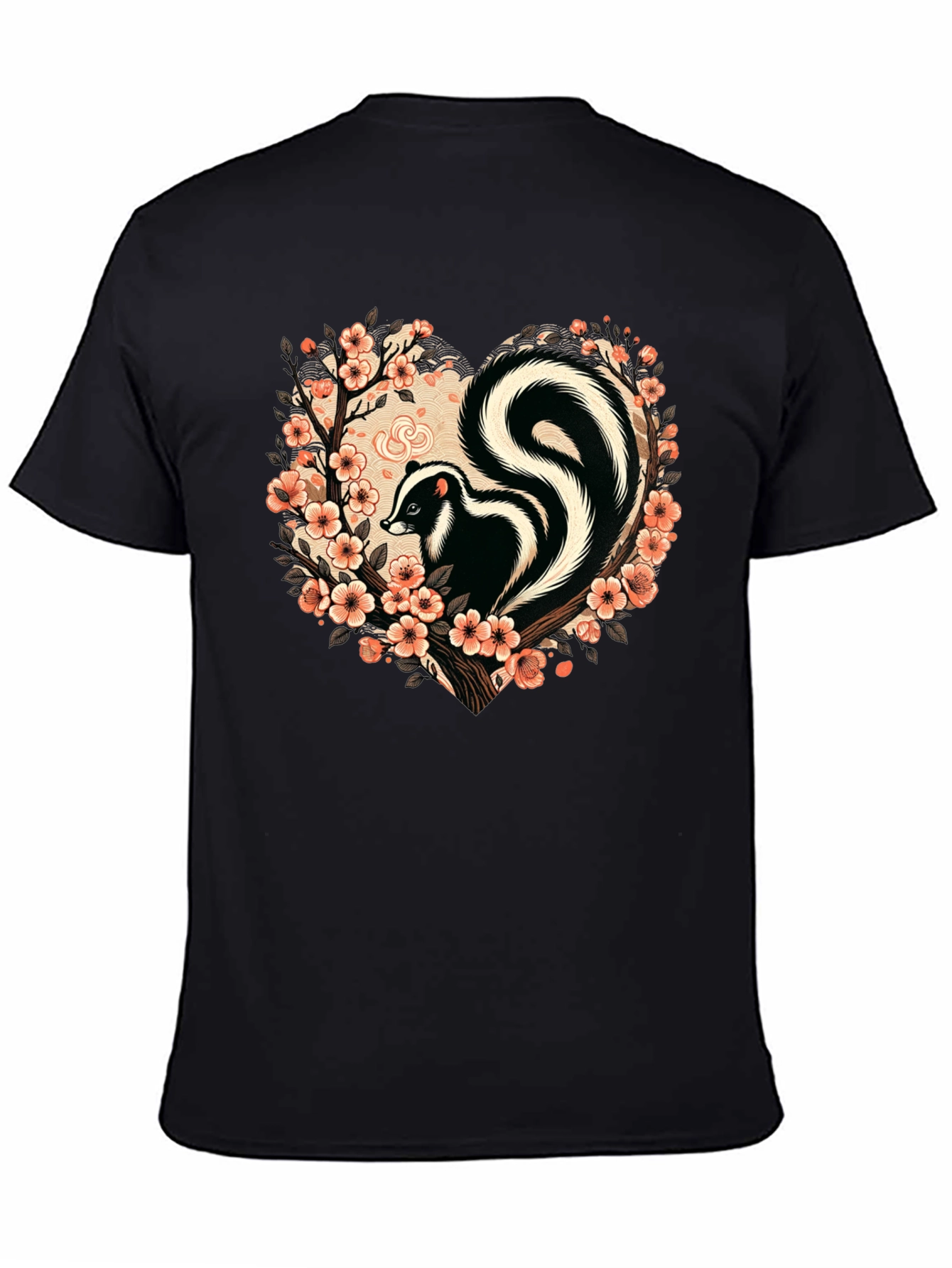 Show off your unique style with this eye-catching black t-shirt featuring a charming skunk design. The skunk is nestled within a heart-shaped arrangement of delicate blossoms, creating a beautiful contrast between the bold animal and the soft floral elements. This shirt is perfect for animal lovers and those who appreciate distinctive graphic tees. The classic crew neck and comfortable fit make it ideal for everyday wear, while the striking design ensures you'll stand out from the crowd. Add a touch of whimsy to your wardrobe with this must-have skunk t-shirt!
