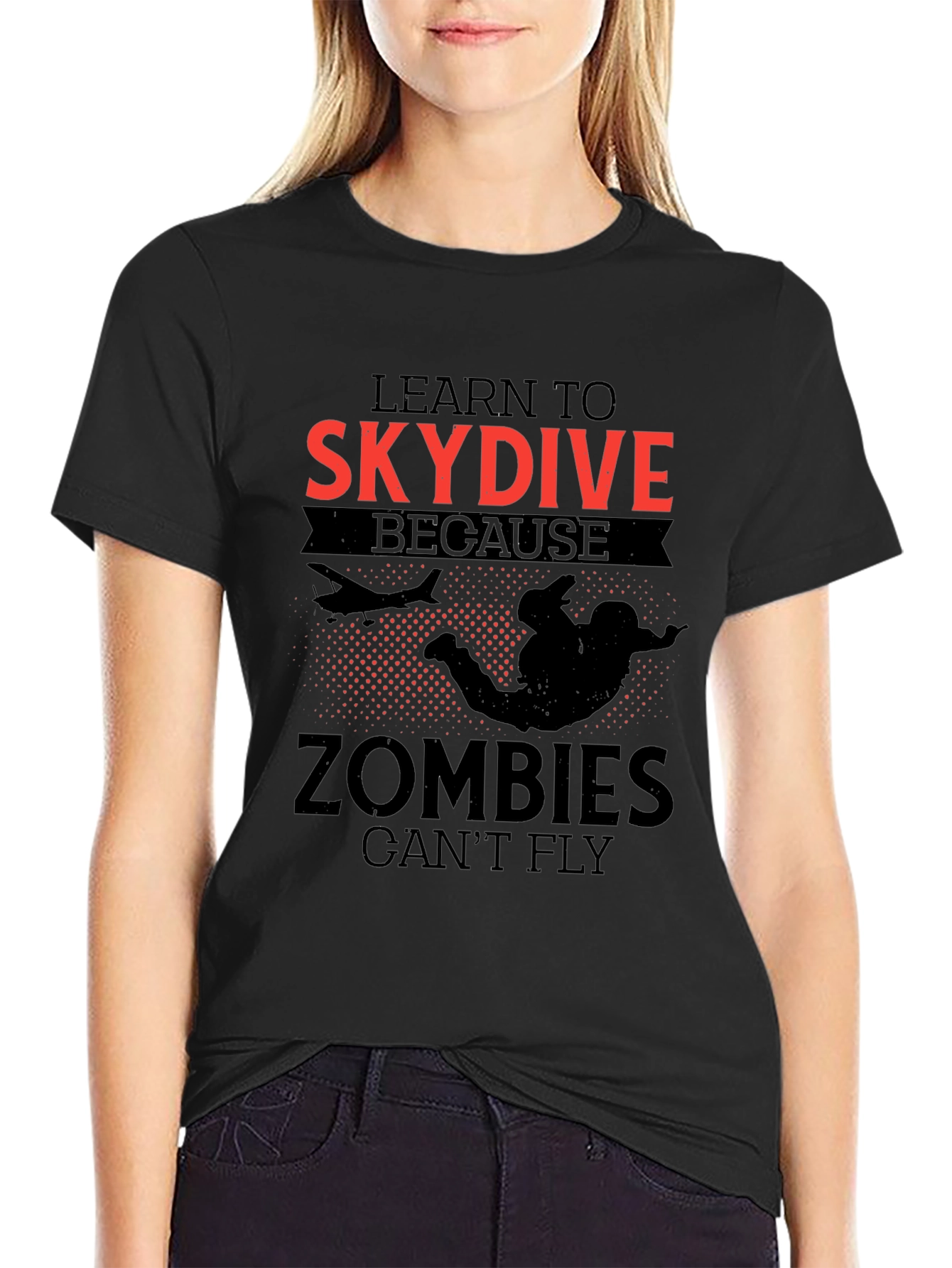 Gear up with this unique black graphic tee! The design features the bold statement 'Learn to Sky Dive BECAUSE Zombies Can't Fly,' perfect for thrill-seekers and zombie enthusiasts alike. The vivid design incorporates a silhouette of a plane and a skydiver set against a vintage-style backdrop. Made from comfortable materials, this t-shirt is ideal for casual wear, skydiving adventures, or zombie-themed events. Show off your unique sense of humor and style with this standout piece!