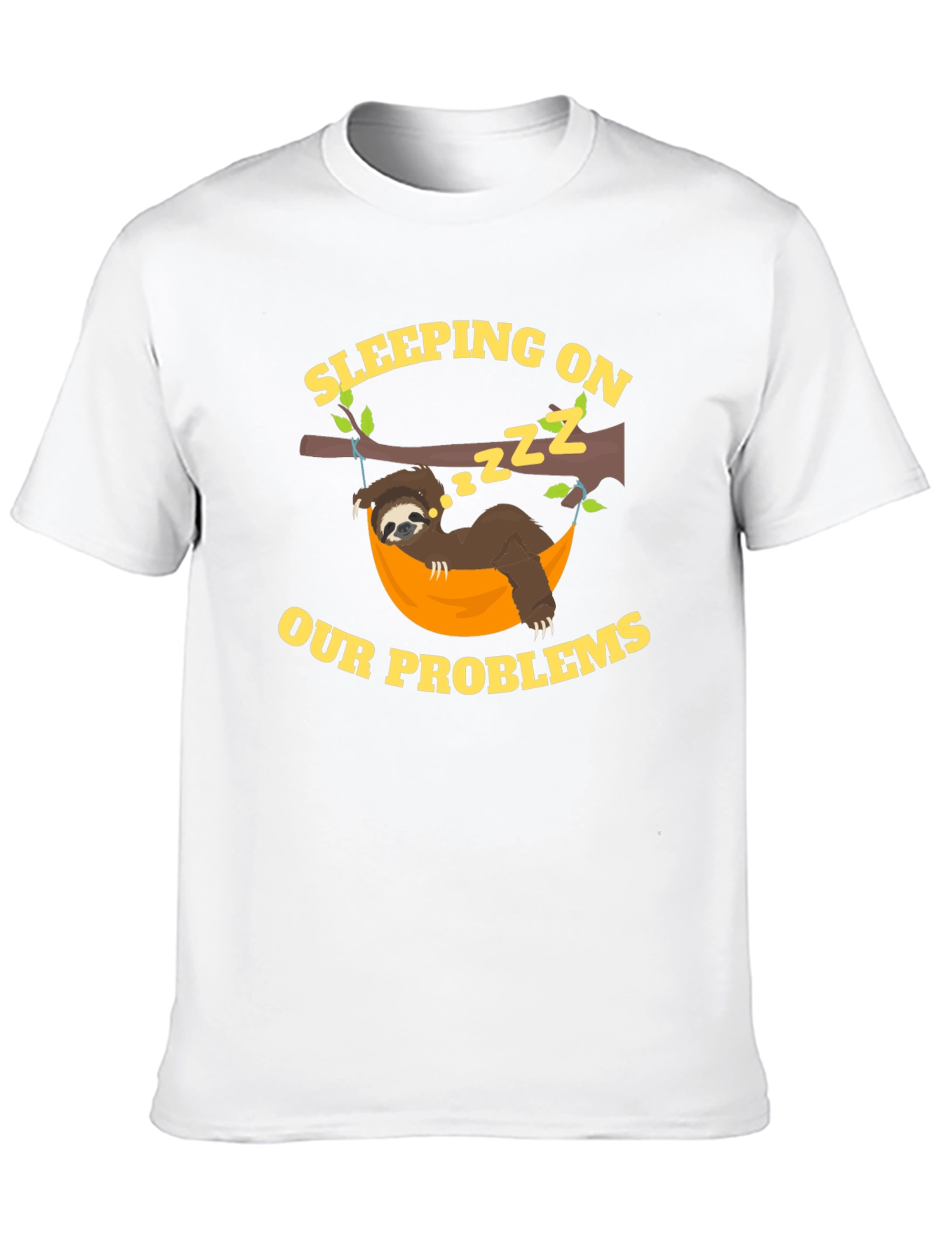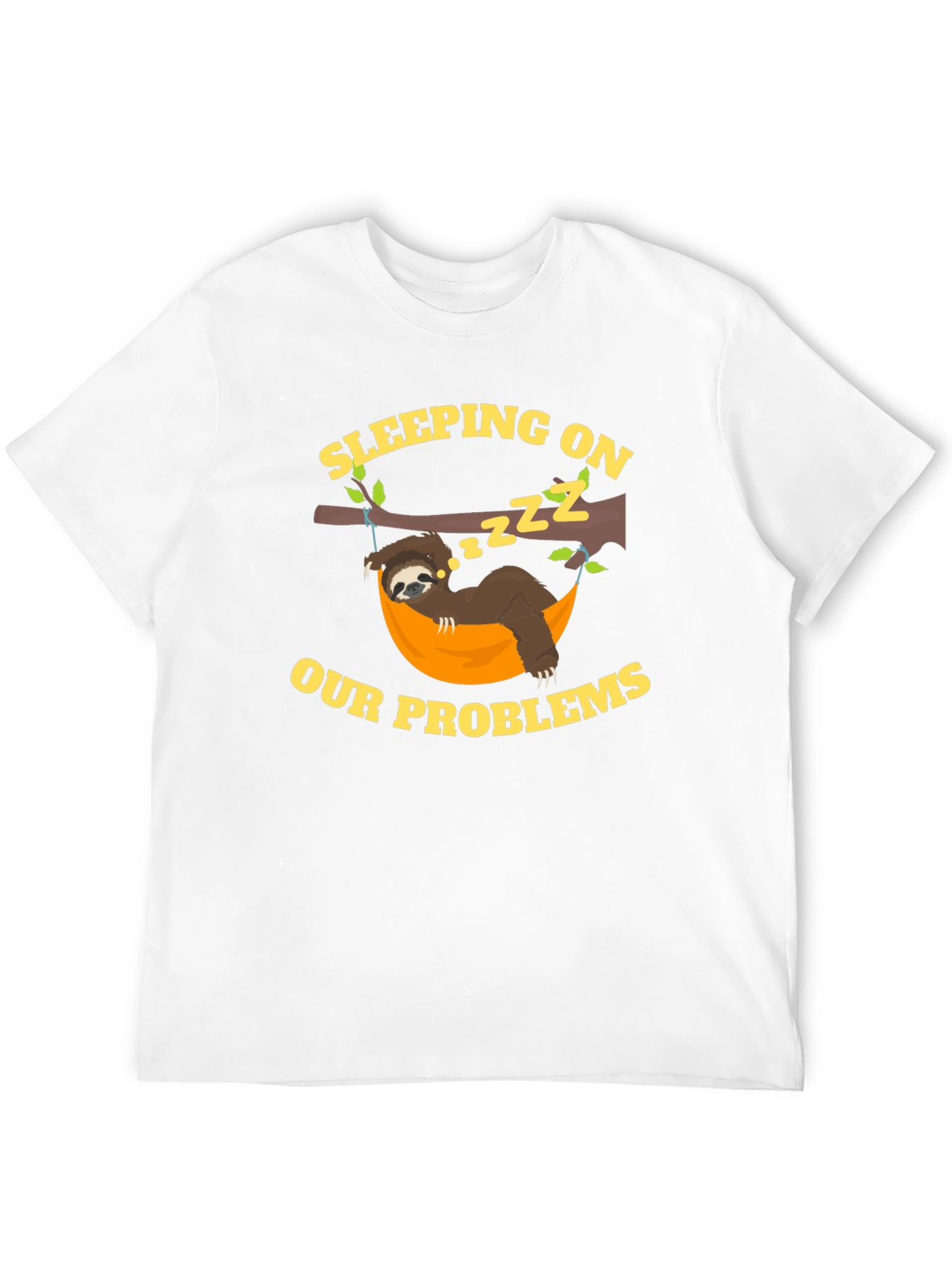 Drift off in style with this black graphic t-shirt. Featuring a humorous design of a sloth sleeping in a hammock, the tee is playfully printed with 'Sleeping on Our Problems'. Made from comfortable, breathable fabric, this tee is perfect for casual wear, lounging at home, or a fun night out. The vibrant yellow graphic stands out against the black background. Show off your laid-back attitude and make a statement with this unique and comfortable t-shirt. It is a fun conversation starter and a comfy addition to any wardrobe.