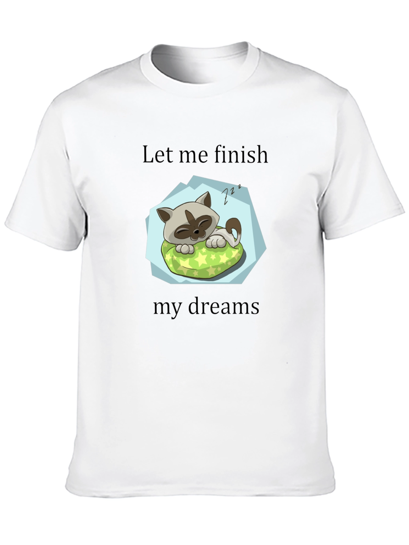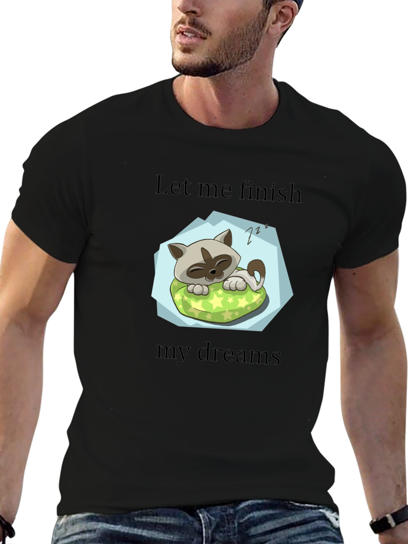 This black graphic tee features a charming cartoon design of a sleeping cat on a pillow. The cat is snuggled up on a green star-patterned cushion, surrounded by a light blue backdrop. Above and below the image, the phrases "Let me finish" and "my dreams" are printed in a simple, readable font. This t-shirt is perfect for cat lovers, dreamers, or anyone who appreciates a cute and comfortable piece of clothing. Wear it casually for everyday use, or as a fun statement piece. Made from soft, breathable fabric for maximum comfort.