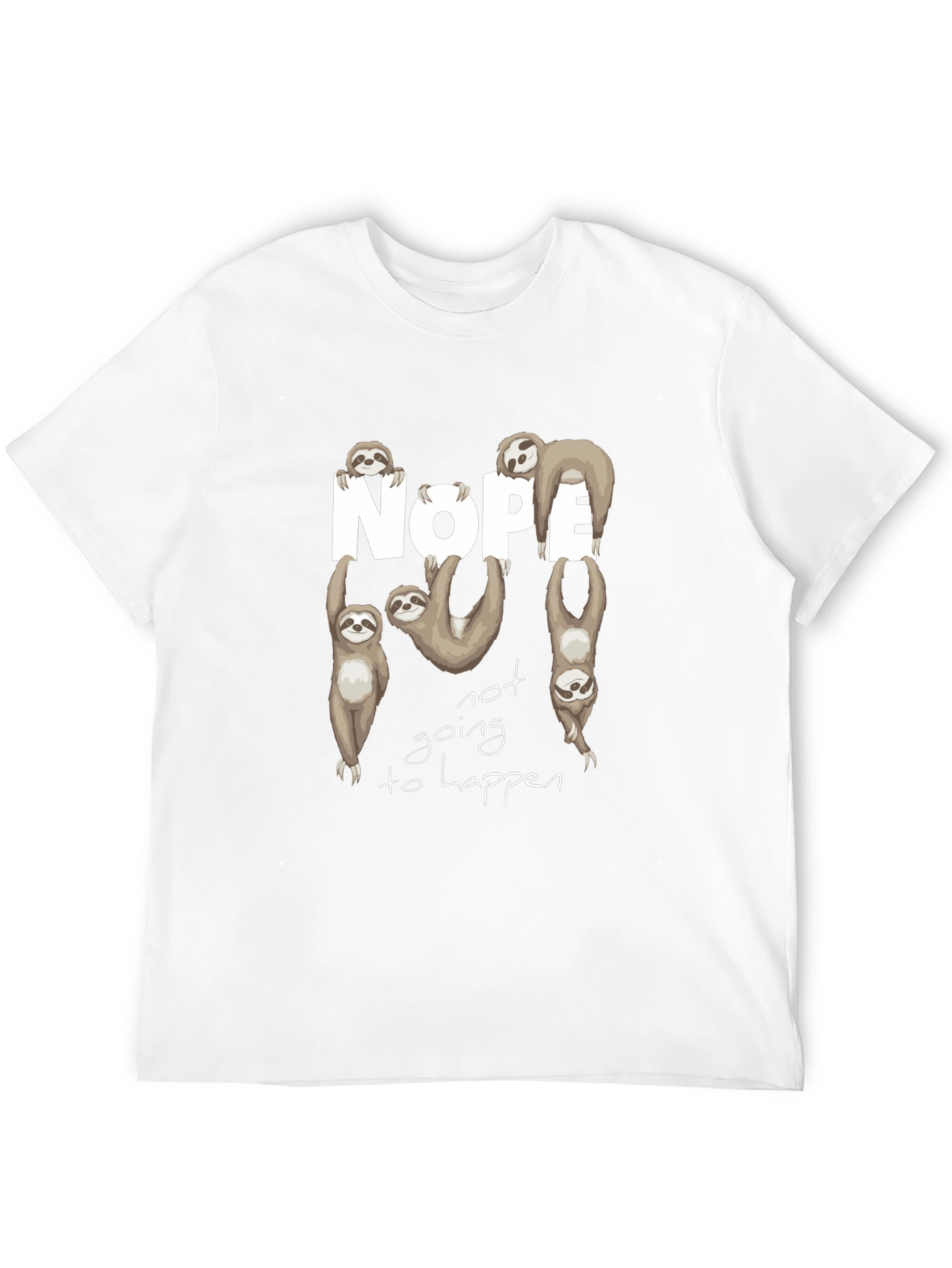 This black t-shirt features a humorous and adorable design of sloths clinging to the letters spelling out 'NOPE.' Below them, the phrase 'not going to happen' is written in a playful script. This tee is perfect for anyone who loves sloths, humor, or just wants to express their relaxed attitude. Made from a comfortable, soft fabric, it's ideal for casual wear, lounging, or making a statement. Show off your laid-back style with this unique and eye-catching sloth t-shirt.