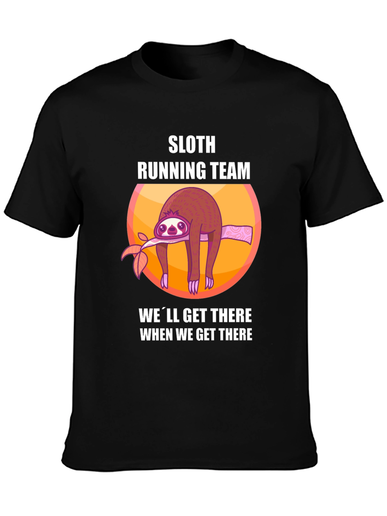 Show off your relaxed style with this novelty Sloth Running Team t-shirt! The fun graphic features a cute sloth hanging from a branch inside a circular frame, along with the witty saying "We'll get there when we get there." Made from a soft, comfortable fabric (material not specified), this black tee is perfect for casual wear, lounging at home, or making a statement at your next get-together. It's an ideal gift for anyone who loves sloths, appreciates a good joke, or prefers to take life at a slower pace. Get yours today and embrace the sloth life!