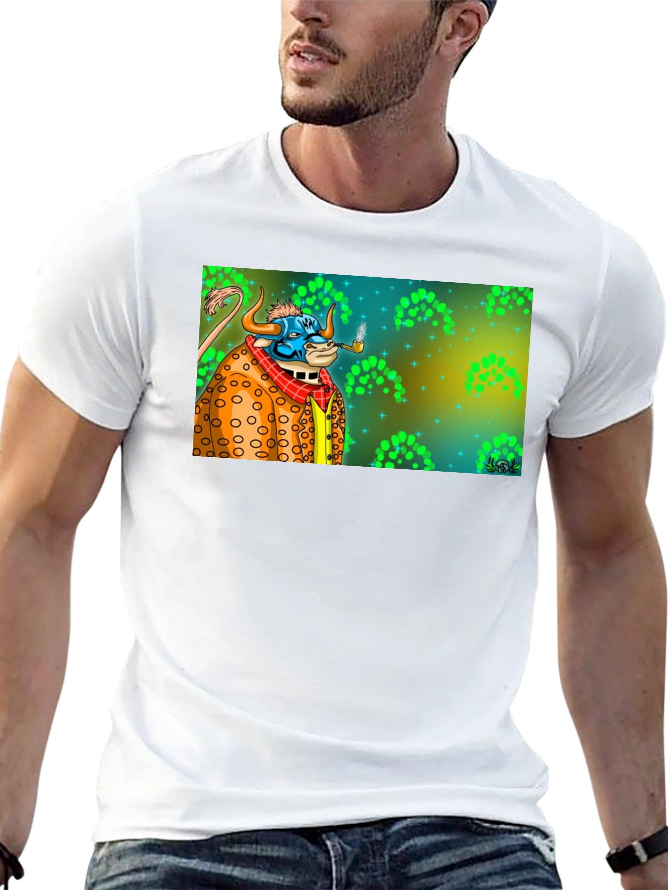 Make a statement with this unique men's black t-shirt. It features a vibrant graphic of a blue-faced bull character sporting an orange patterned coat, red scarf, and smoking a pipe, set against a stylized backdrop. Made from what appears to be a comfortable cotton blend, this tee offers both style and comfort. The bold graphic design is perfect for adding a touch of personality to your casual wear. Whether you're hanging out with friends, hitting the town, or just relaxing at home, this eye-catching t-shirt is sure to turn heads. Get yours today and showcase your unique style!
