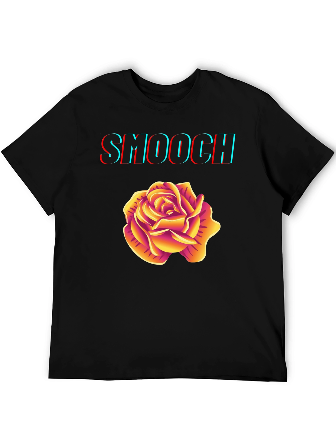 Elevate your casual wardrobe with this striking black t-shirt featuring a unique "Smooch" text design in a vibrant 3D effect, complemented by a stunning gradient rose graphic. The smooth, comfortable fabric makes it perfect for everyday wear. This tee offers a modern, stylish look. Ideal for casual outings, concerts, or adding a touch of artistic flair to your everyday style. Stand out from the crowd with this bold and eye-catching t-shirt!