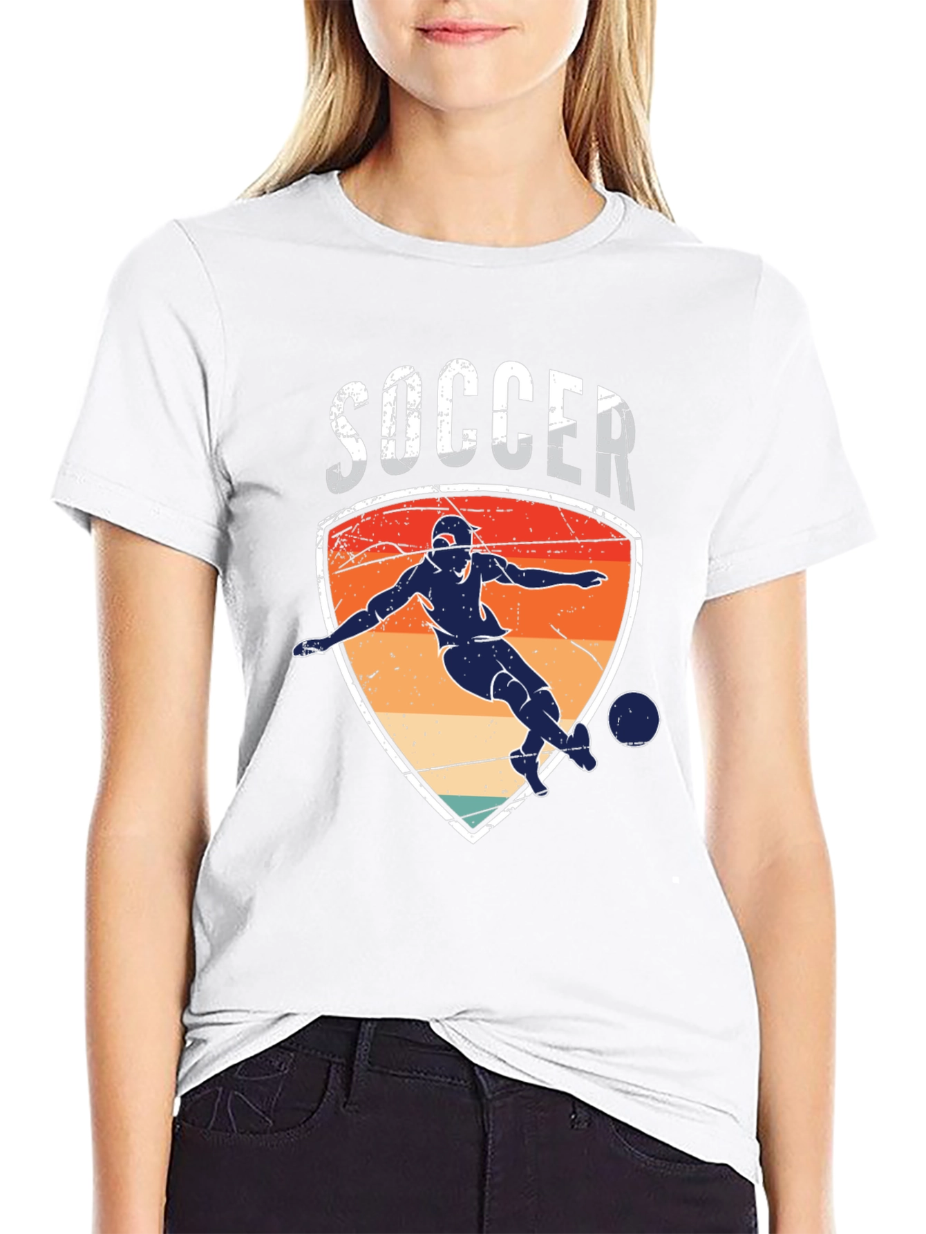 Score a goal in style with this retro-inspired soccer graphic tee! This black t-shirt features a bold design of a soccer player in action against a vintage sunset backdrop, framed within a distressed shield. The word "SOCCER" is prominently displayed above the graphic in a classic font. Perfect for soccer enthusiasts and anyone who loves unique, eye-catching apparel. Made from a comfortable fabric blend, this tee is ideal for casual wear, sports practices, or showing off your passion for the beautiful game. Add this standout piece to your wardrobe and make a statement!