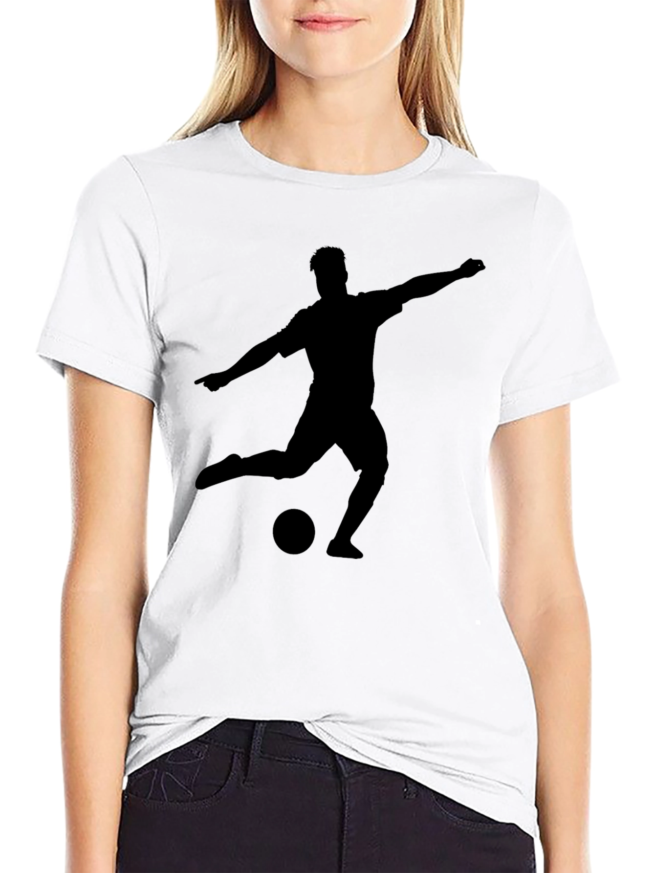 Showcase your love for soccer with this stylish black t-shirt. Featuring a striking silhouette of a soccer player in action, this tee is perfect for athletes and fans alike. The classic design is printed on a comfortable fabric, ensuring a great fit and feel. Ideal for casual wear, sports events, or simply expressing your passion for the game. A must-have addition to any soccer enthusiast's wardrobe.