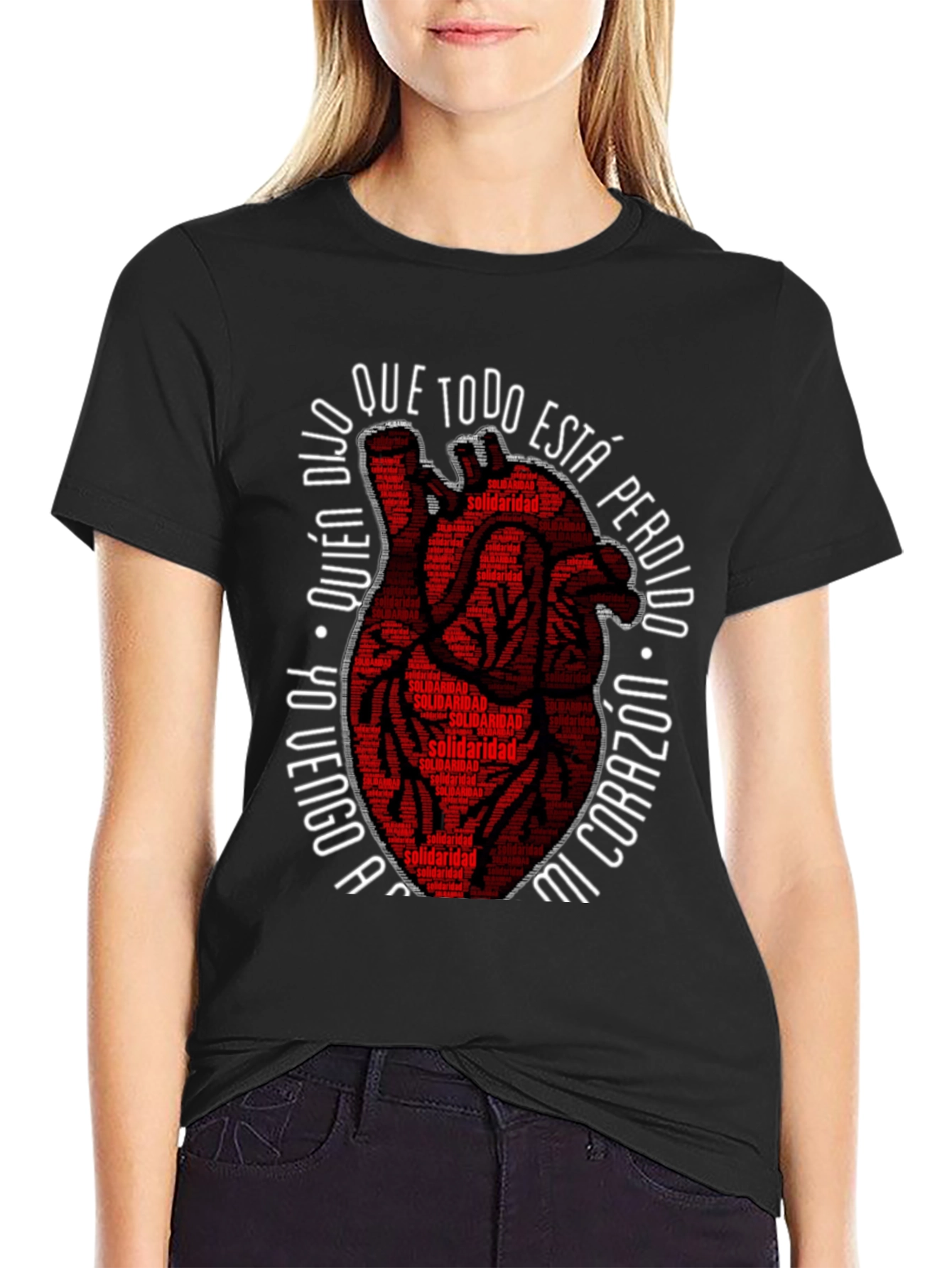 Show your support with this unique black tee! The striking design features a red heart filled with the word "solidaridad," surrounded by impactful Spanish text. Made from a comfortable-looking fabric, this t-shirt is ideal for casual wear, rallies, or simply expressing your values. The bold graphic makes a statement while maintaining a stylish look. Wear your heart on your sleeve, or rather, on your chest, with this meaningful and eye-catching t-shirt.