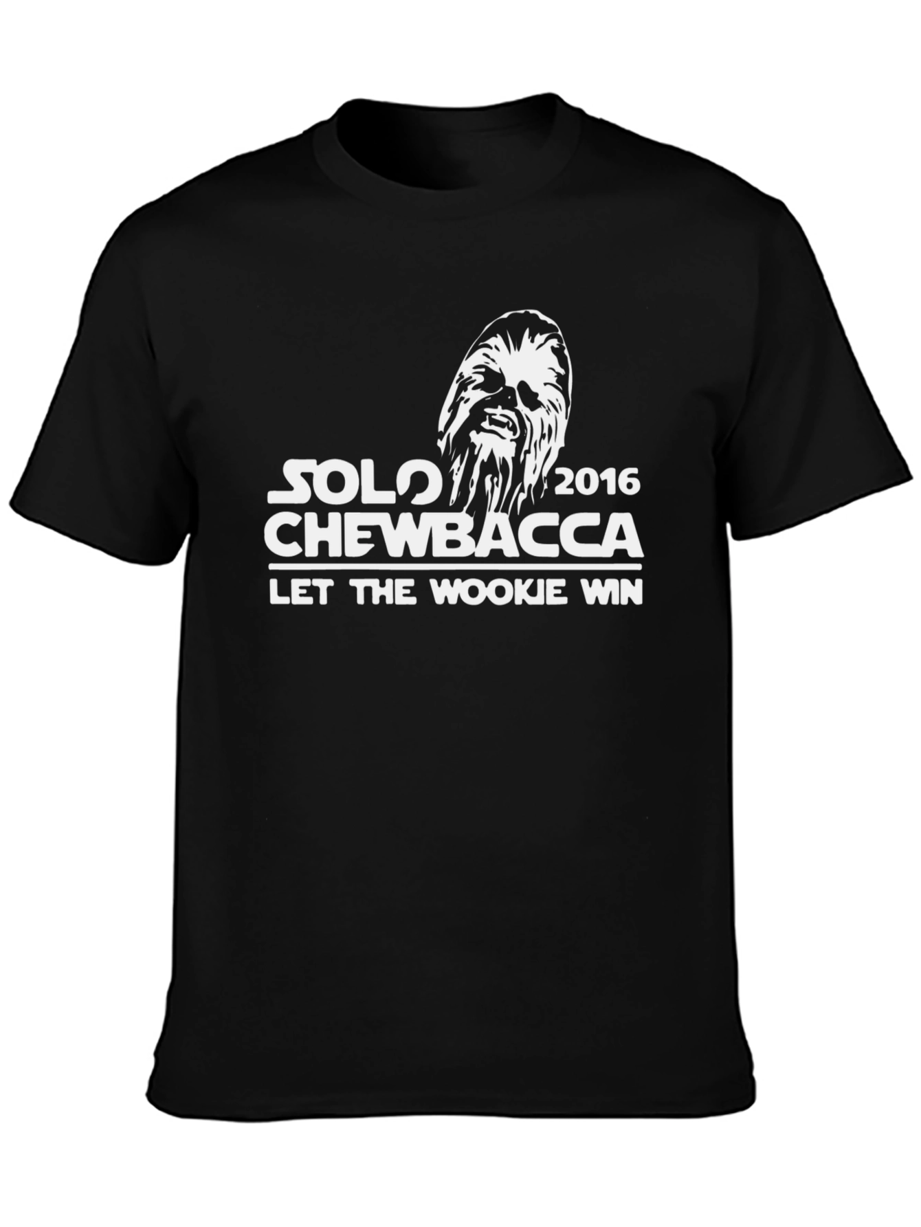 Show your support for the Wookiee with this unique "Solo Chewbacca 2016" t-shirt. Featuring a bold graphic print, this shirt is a playful political nod. The design showcases Chewbacca's silhouette along with the slogan "Let The Wookiee Win." Made from what appears to be comfortable cotton material, the classic black tee is perfect for casual wear, sci-fi conventions, or making a statement. Whether you're a Star Wars fan or a lover of clever designs, this tee is sure to grab attention. It's a fun way to express your personality and add a touch of humor to your wardrobe.