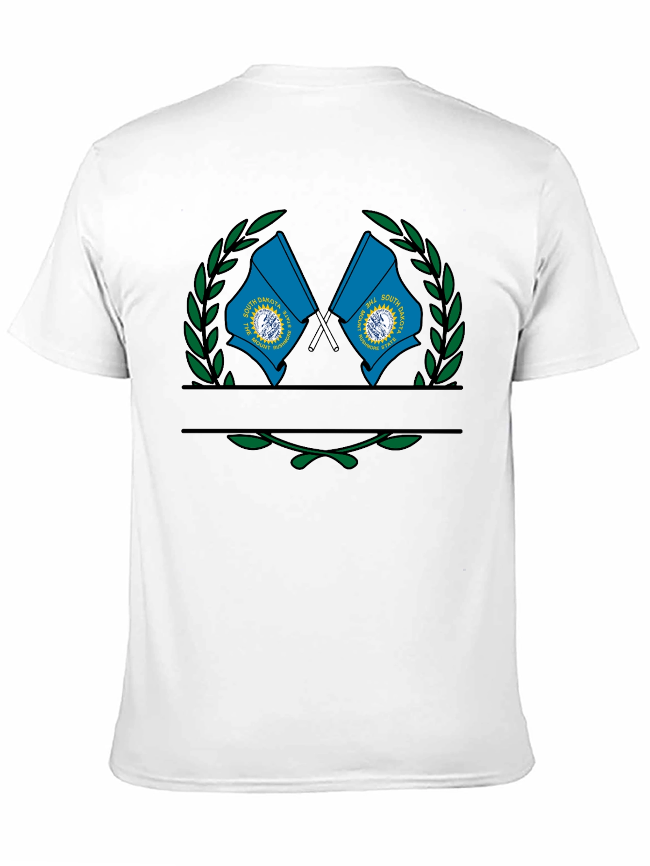 Show your South Dakota pride with this stylish black t-shirt. The design features two crossed South Dakota state flags encircled by a green laurel wreath, creating a unique and eye-catching graphic. Made from a comfortable fabric, this tee is perfect for everyday wear, showcasing your love for the Mount Rushmore State. Ideal for casual outings, state events, or as a thoughtful gift for friends and family, this t-shirt combines comfort with a patriotic touch. Get yours today and represent South Dakota in style!