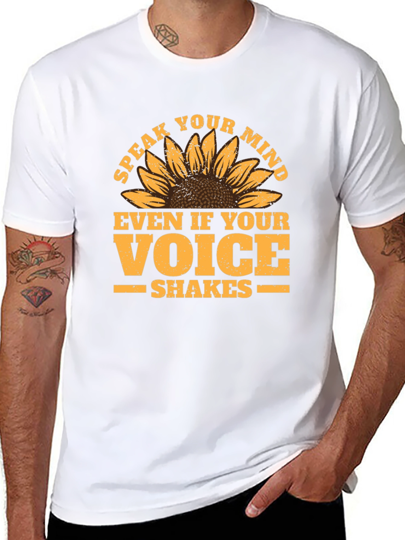 This black t-shirt features a striking sunflower graphic combined with an empowering message: "Speak Your Mind, Even If Your Voice Shakes". The design is printed in a distressed yellow-orange color, giving it a vintage, worn-in feel. The sunflower element adds a touch of nature and positivity to the overall look. Made from a comfortable-looking fabric, this tee appears perfect for everyday wear. It's a great way to express yourself and make a statement while staying stylish and casual. This shirt is ideal for casual outings, social gatherings, or simply lounging around at home. Show off your confidence and embrace your voice with this unique and eye-catching t-shirt!