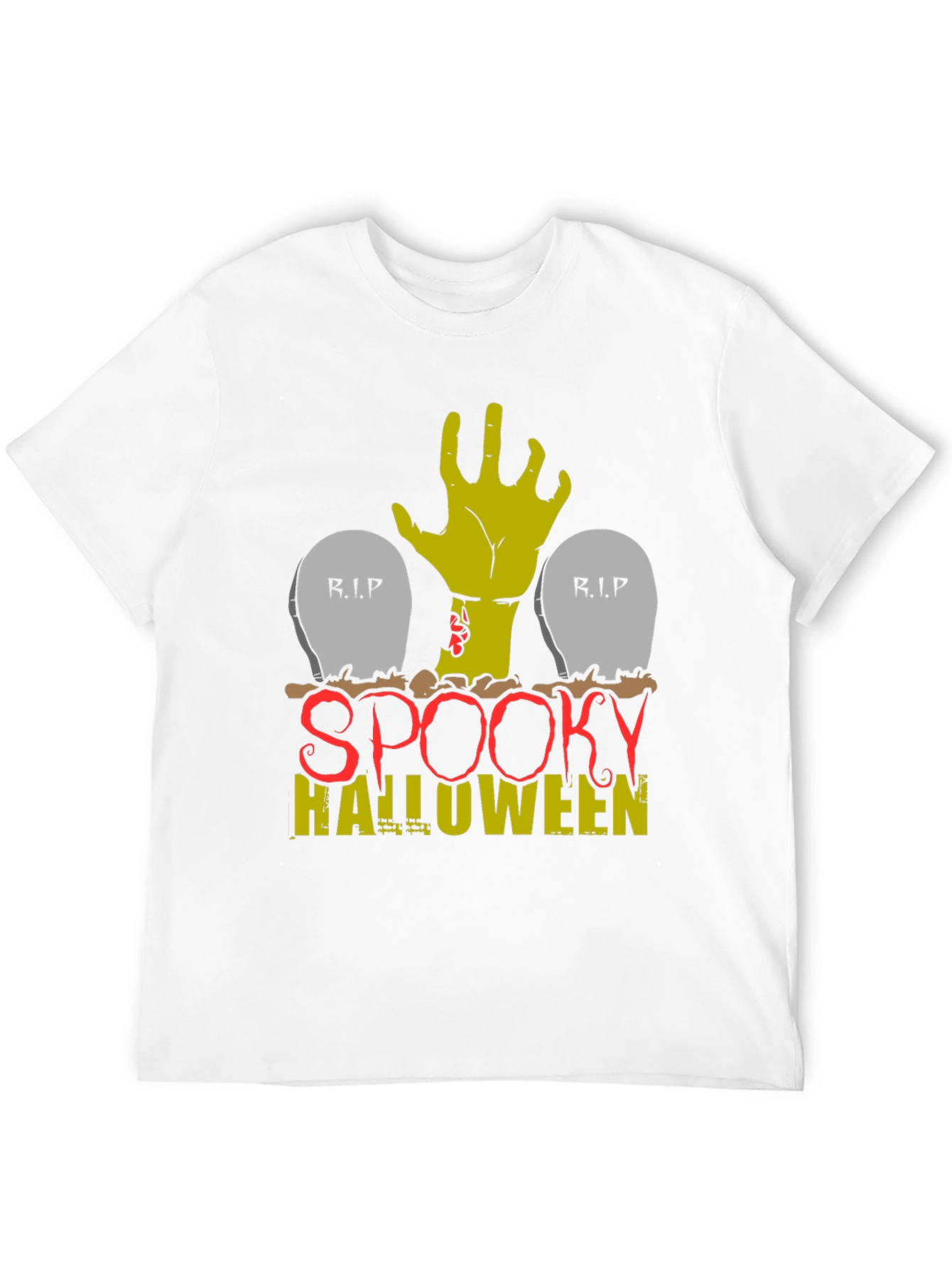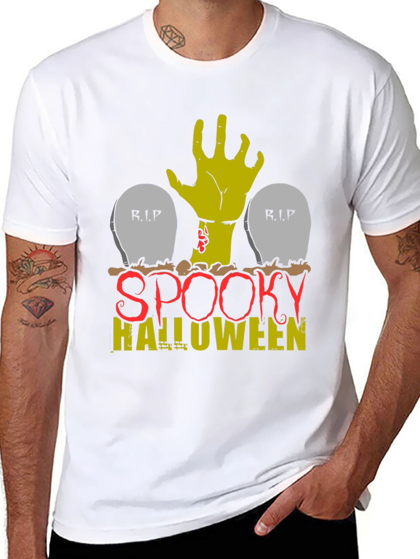 Get ready for Halloween with this eye-catching black t-shirt! The design features a spooky zombie hand rising from the grave between two tombstones, with the words "SPOOKY HALLOWEEN" in a striking red and yellow font. Perfect for Halloween parties, casual wear, or showing off your love for all things spooky. Made from a comfortable fabric, this tee is sure to be a hit. Grab yours today and embrace the Halloween spirit!