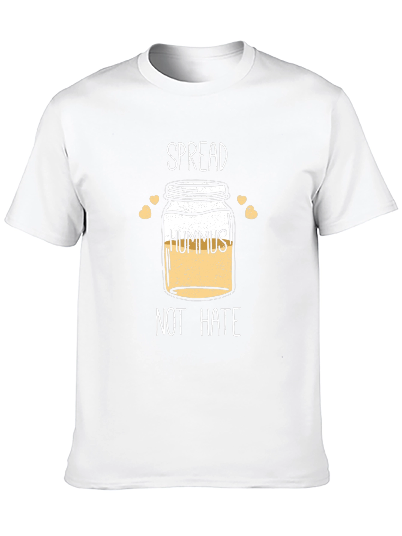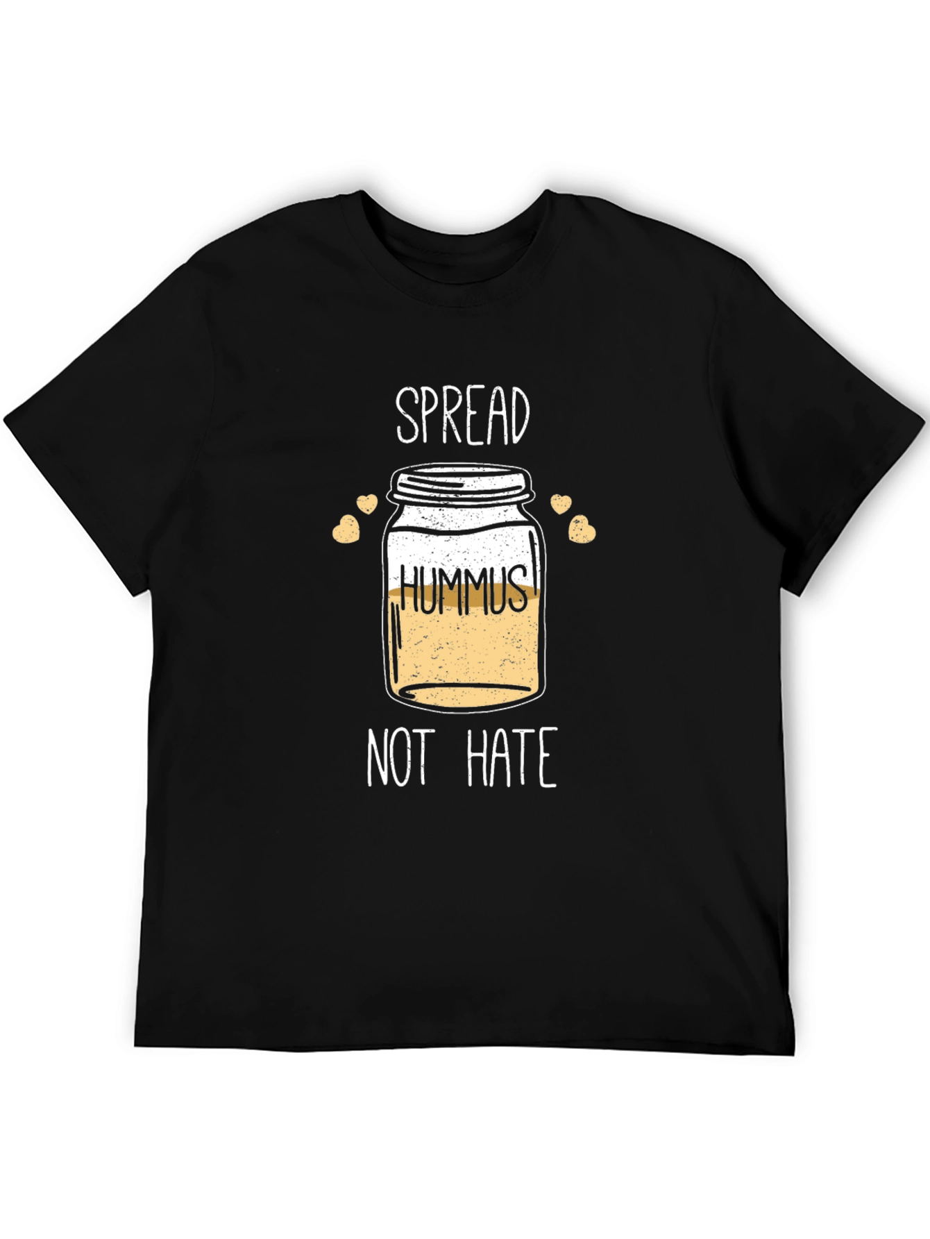 Show off your love for hummus with this eye-catching graphic t-shirt. The design features a jar of hummus surrounded by small hearts, paired with the uplifting message "Spread Hummus Not Hate." This fun and trendy t-shirt is made from a comfortable, breathable fabric perfect for everyday wear. The classic black color makes it easy to match with any outfit. Whether you're a vegan foodie, a hummus enthusiast, or simply want to spread a message of positivity, this shirt is a stylish and unique way to express yourself. Great for casual outings, social gatherings, or just lounging around, it makes a statement while keeping you comfortable.