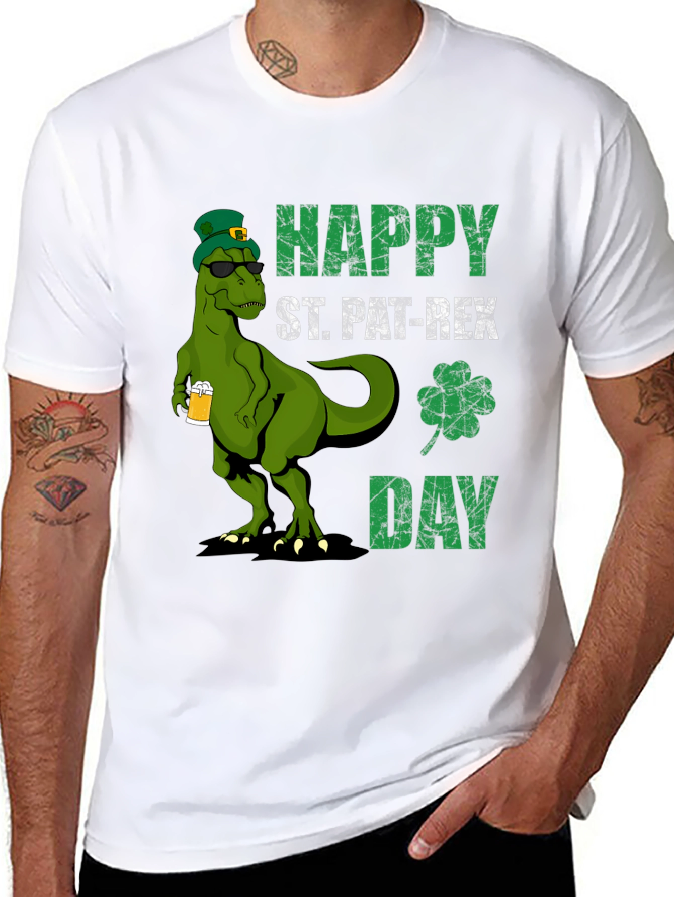 Celebrate St. Patrick's Day with this fun and festive black t-shirt. The tee features a cartoon dinosaur wearing a green leprechaun hat and sunglasses, holding a beer. The words 'Happy St. Pat-Rex Day' are printed in a textured green font above and a four-leaf clover is to the right of the dinosaur. Made from a soft, comfortable fabric, this shirt is perfect for St. Patrick's Day parties, parades, or casual wear. Stand out from the crowd and show off your holiday spirit with this unique and humorous tee.