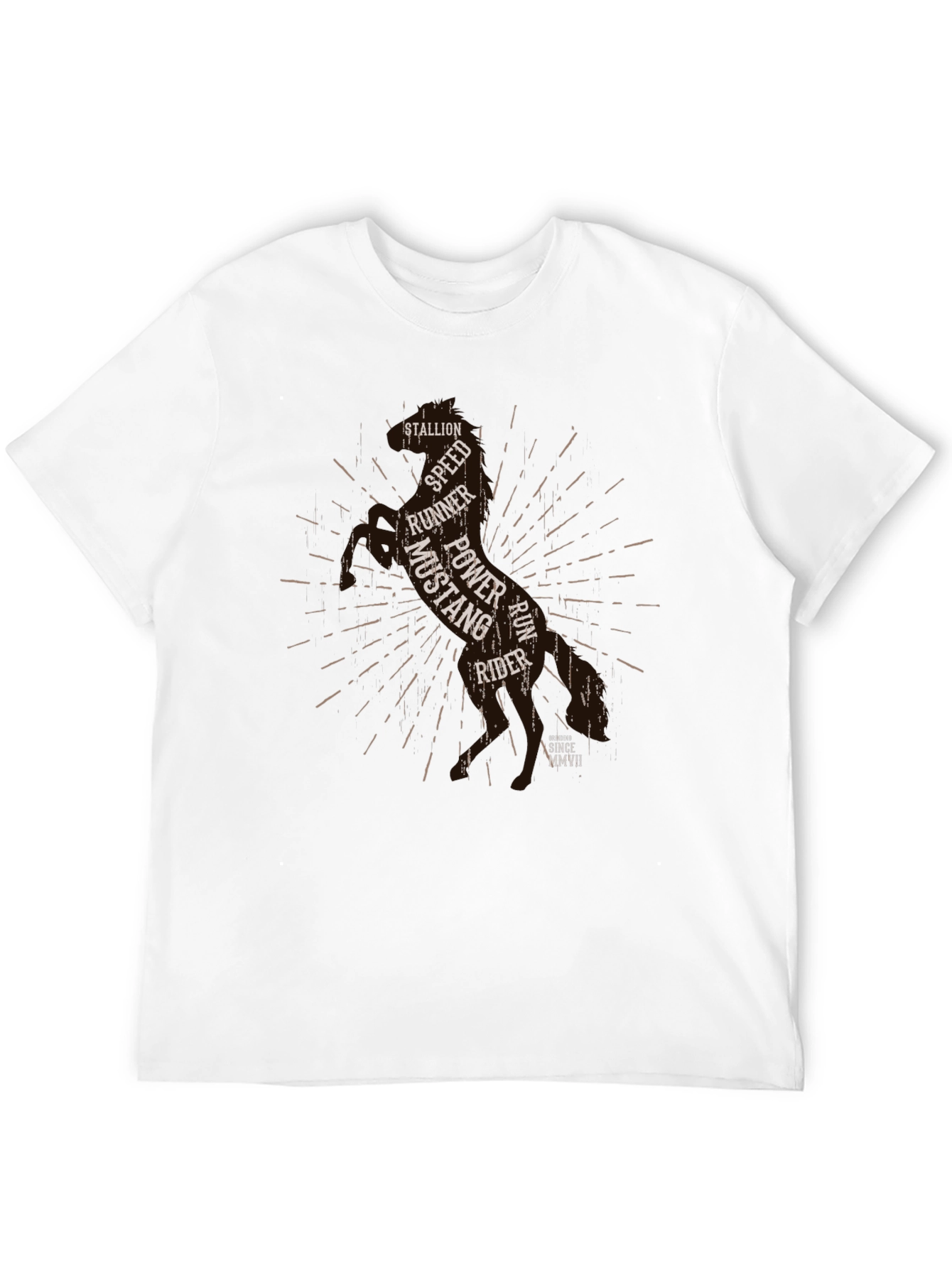 Showcase your love for power and speed with this striking black t-shirt. The design features a unique graphic of a stallion, subtly formed from words like "Stallion," "Speed," "Power," and "Mustang," radiating outwards. Crafted from a comfortable, breathable fabric, this tee is perfect for everyday wear. Ideal for casual outings, car meets, or simply expressing your passion for iconic performance. With its bold design, it's a statement piece that will turn heads. It is a great piece to own or to give as a gift.