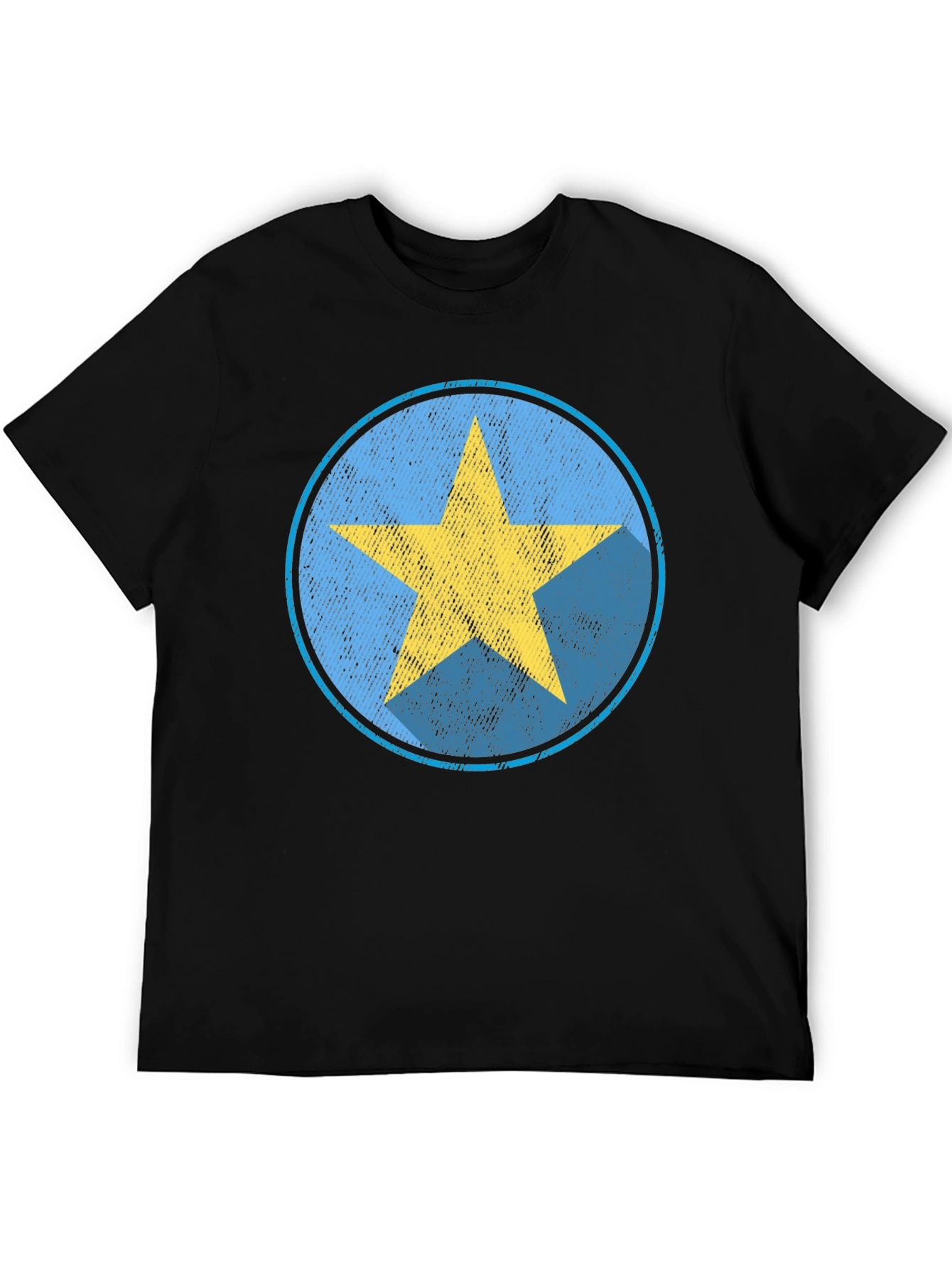 This classic black t-shirt features a striking graphic design. The design is a yellow star within a blue textured circle. The shirt is made from a comfortable-looking material, perfect for everyday wear. This tee offers a casual and stylish look that's great for weekend outings, hanging out with friends, or simply lounging at home. The design adds a unique touch to a wardrobe staple. Pair it with jeans, shorts, or your favorite bottoms for a relaxed yet fashionable ensemble. This t-shirt is a must-have for anyone who appreciates simple and cool designs.