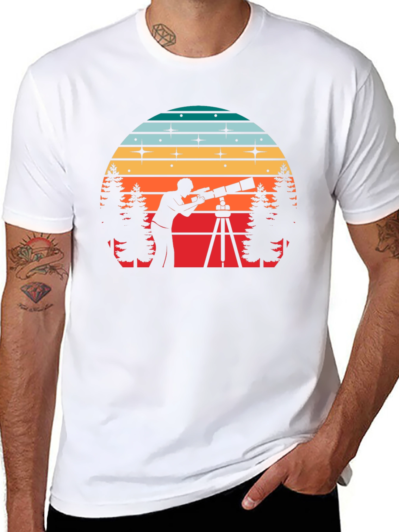Capture the beauty of the cosmos with this eye-catching black t-shirt! Featuring a striking design of a silhouette gazing through a telescope under a vibrant sunset-style gradient sky, complete with stars and pine trees. This unique shirt is perfect for astronomy enthusiasts, nature lovers, or anyone who appreciates a cool, artistic design. Made with comfortable material, this tee is ideal for casual wear, stargazing nights, or as a thoughtful gift for the space lover in your life. Let your passion for the universe shine with this must-have wardrobe staple!