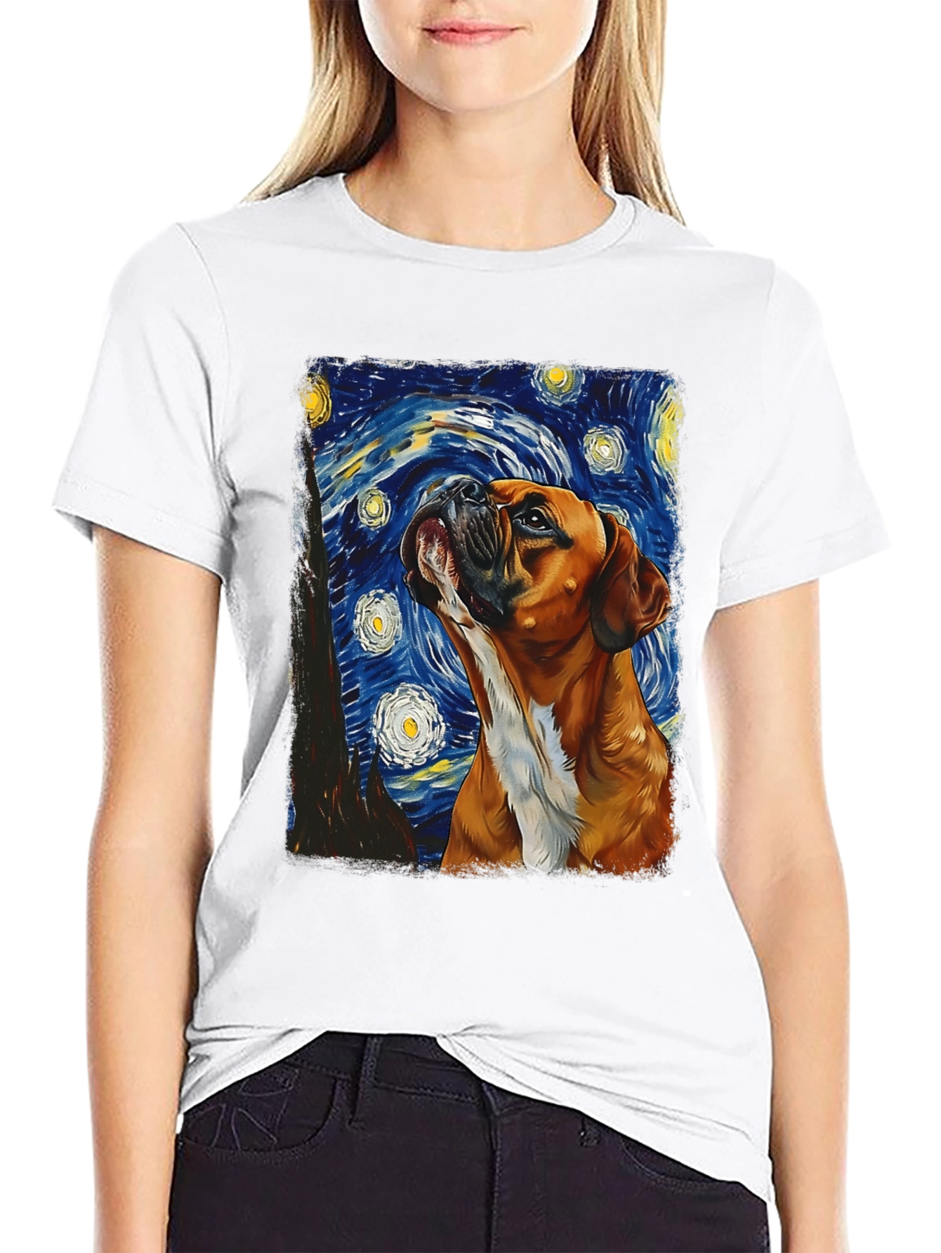 Show your love for art and dogs with this unique T-shirt! Featuring a Boxer dog portrait in the style of Van Gogh's 'Starry Night', this tee is sure to turn heads. Made from a comfortable, breathable fabric, it's perfect for everyday wear. The high-quality print ensures the vibrant colors stay wash after wash. Whether you're a dog lover, an art enthusiast, or just looking for a cool and stylish tee, this shirt is a must-have. Pair it with jeans for a casual look or dress it up with a blazer for a night out. Get yours today and let your personality shine!
