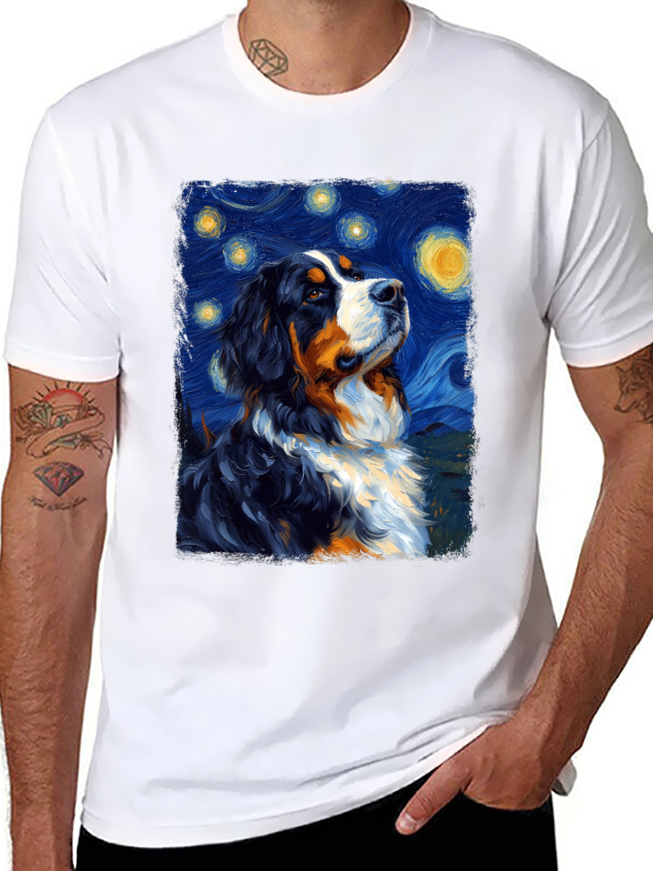 Show your love for Bernese Mountain Dogs with this unique t-shirt! The design features a beautiful Bernese Mountain Dog portrait in the style of Van Gogh's Starry Night. The vibrant colors and swirling brushstrokes create a captivating image that is sure to turn heads. Made from a comfortable, breathable fabric, this t-shirt is perfect for everyday wear. Whether you're walking your dog, running errands, or simply relaxing at home, this shirt is a stylish way to express your passion for dogs and art. A must-have for any dog lover's wardrobe!