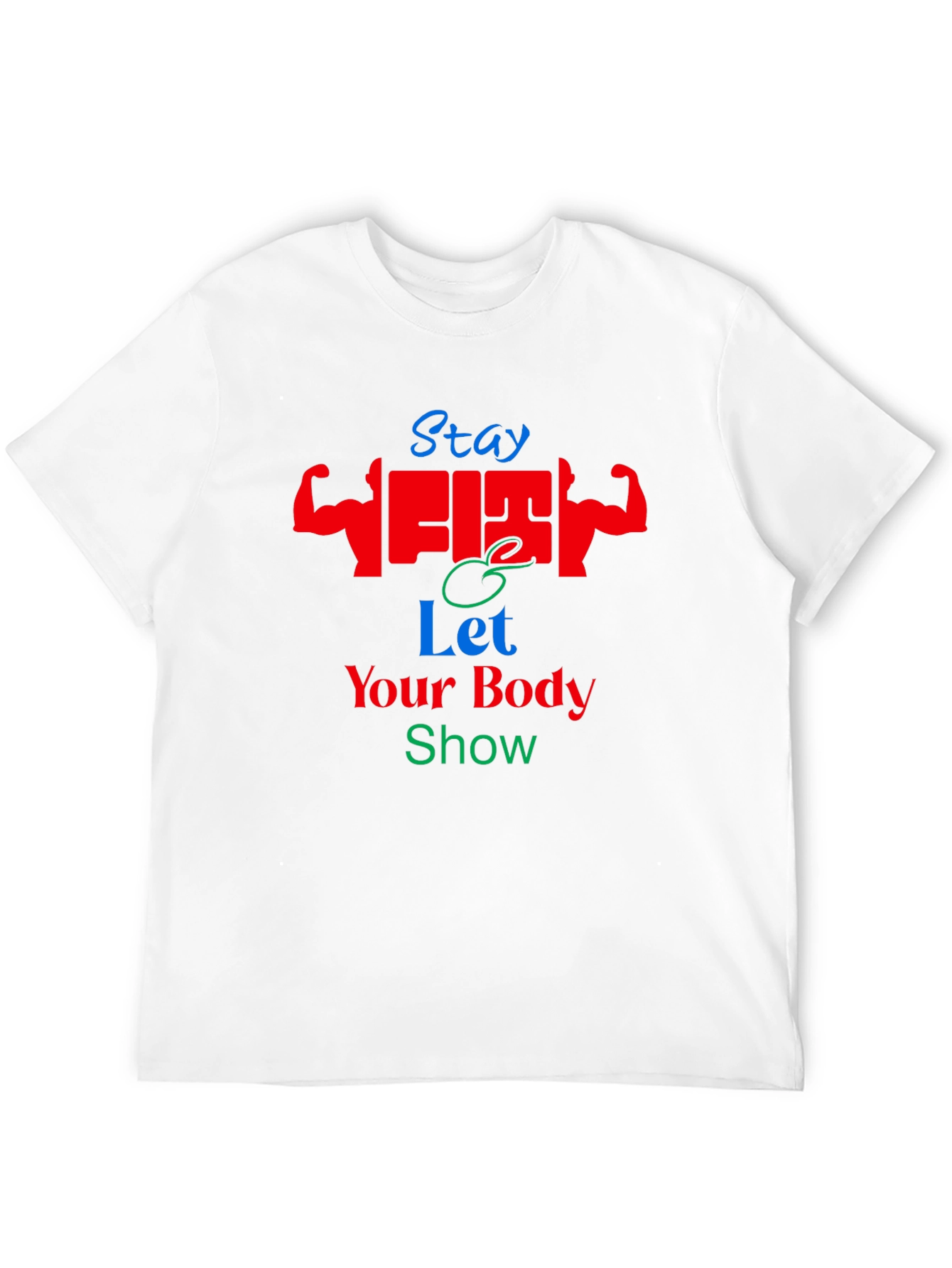 Show off your dedication to fitness with this eye-catching black t-shirt. The design features the phrase "Stay Fit & Let Your Body Show" in vibrant colors, with stylized muscular arms flanking the word "FIT". This short-sleeved tee is perfect for workouts, casual outings, or just lounging at home. Made from comfortable materials, this shirt combines style and comfort. Grab this shirt to display your hard work at the gym!
