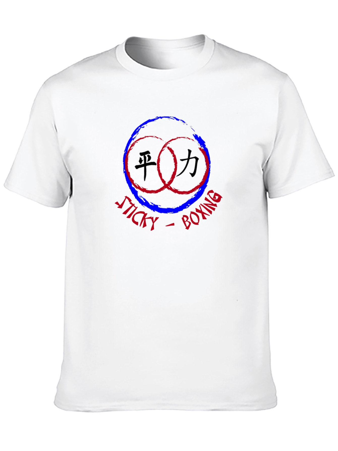 Showcase your love for martial arts with this eye-catching black t-shirt. The unique design features two overlapping circles in red and blue, surrounding Asian characters. Bold red "STICKY BOXING" text adds a modern and edgy touch. Made from soft, comfortable fabric, this tee is perfect for casual wear or your next training session. Whether you're a dedicated martial artist or just appreciate stylish graphic tees, this shirt will make a statement. Pair it with jeans or athletic wear for a cool and confident look.