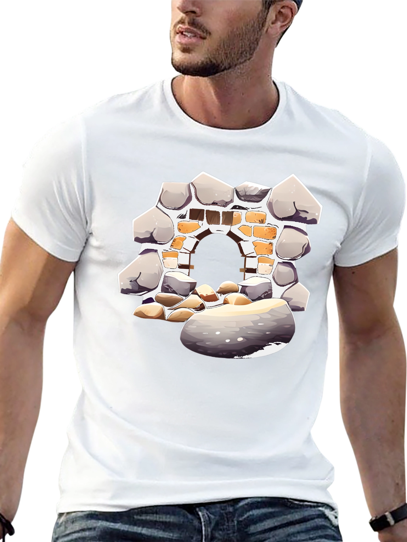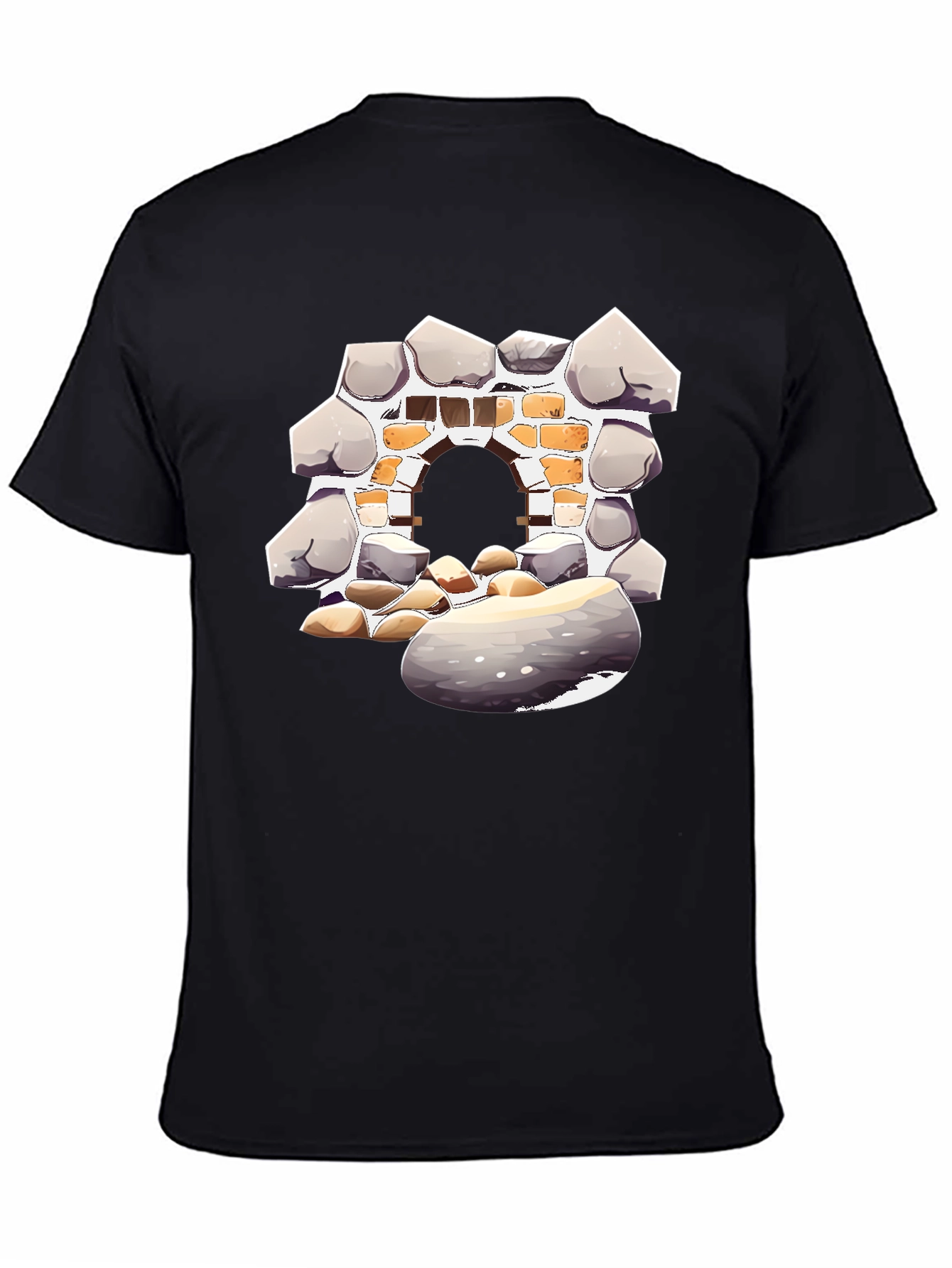 Showcase your unique style with this striking black T-shirt featuring a captivating graphic of a stone archway. The design boasts a detailed stone and brick structure, creating an illusion of depth and texture. Crafted from a comfortable material, this tee is perfect for everyday wear. Ideal for casual outings, concerts, or simply lounging at home, this T-shirt adds a touch of artistic flair to any outfit. Its versatile design pairs effortlessly with jeans, shorts, or even layered under a jacket. Make a statement and express your individuality with this must-have graphic tee.