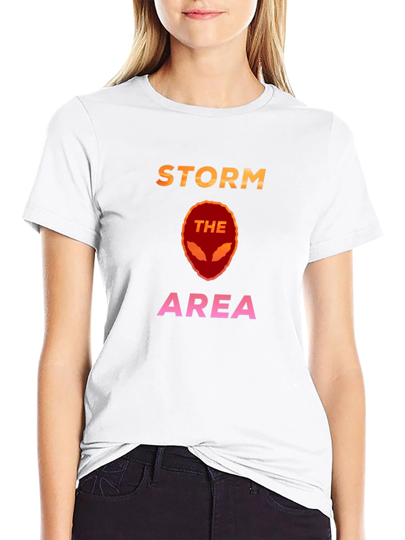 Stand out with this eye-catching black t-shirt featuring a unique "Storm the Area" alien graphic. The design includes vibrant orange and pink lettering and an alien head emblem. Made from a comfortable, breathable fabric, this tee is perfect for casual wear, expressing your individuality, or making a statement. Show off your unique style with this conversation-starting piece. Whether you're a UFO enthusiast or just love bold designs, this tee is a must-have addition to your wardrobe. Ideal for everyday wear or as a quirky gift for friends and family.